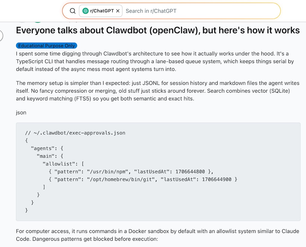 In one widely discussed r/ChatGPT thread titled “Everyone talks about Clawdbot / OpenClaw, but here’s what’s actually going on”, users broke down the project’s internals in plain terms.