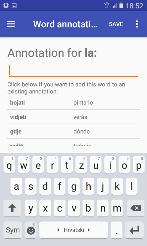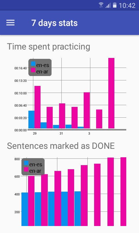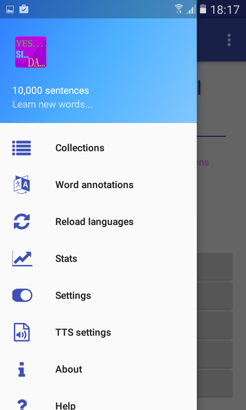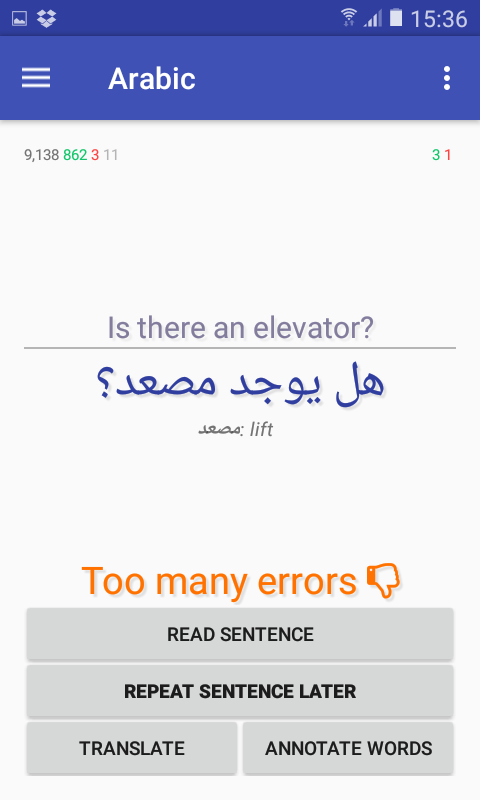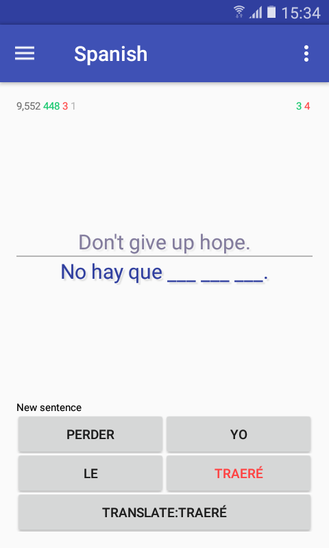 This is a small app for language learners. The goal is not to teach you a language, but to be exposed to more words and sentences in foreign languages. When you learn a new language from textbooks, most of the vocabulary is related to greetings, food and transportation. Serious language learners need a source of texts where they can be exposed to a larger vocabulary. And this is what this app is about. The app is basically a quiz where the user needs to guess all the words in a single sentence. The app has 24 languages (but in two "directions", for example "French for English speakers" and "English for French speakers") and cca 10,000 sentences for each language. The app is integrated with Google translate to help with new words.