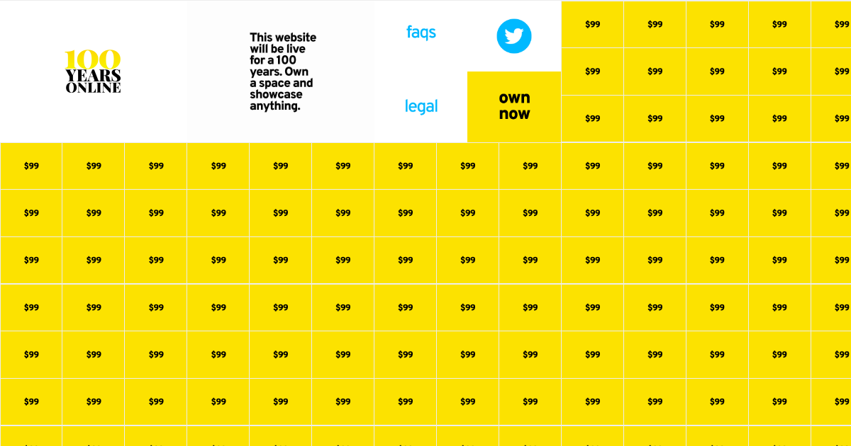 This is a stupid fun side project. A website that'll be online for 100 years! You can own a space on the website and showcase anything you want for 100 years @ $99.