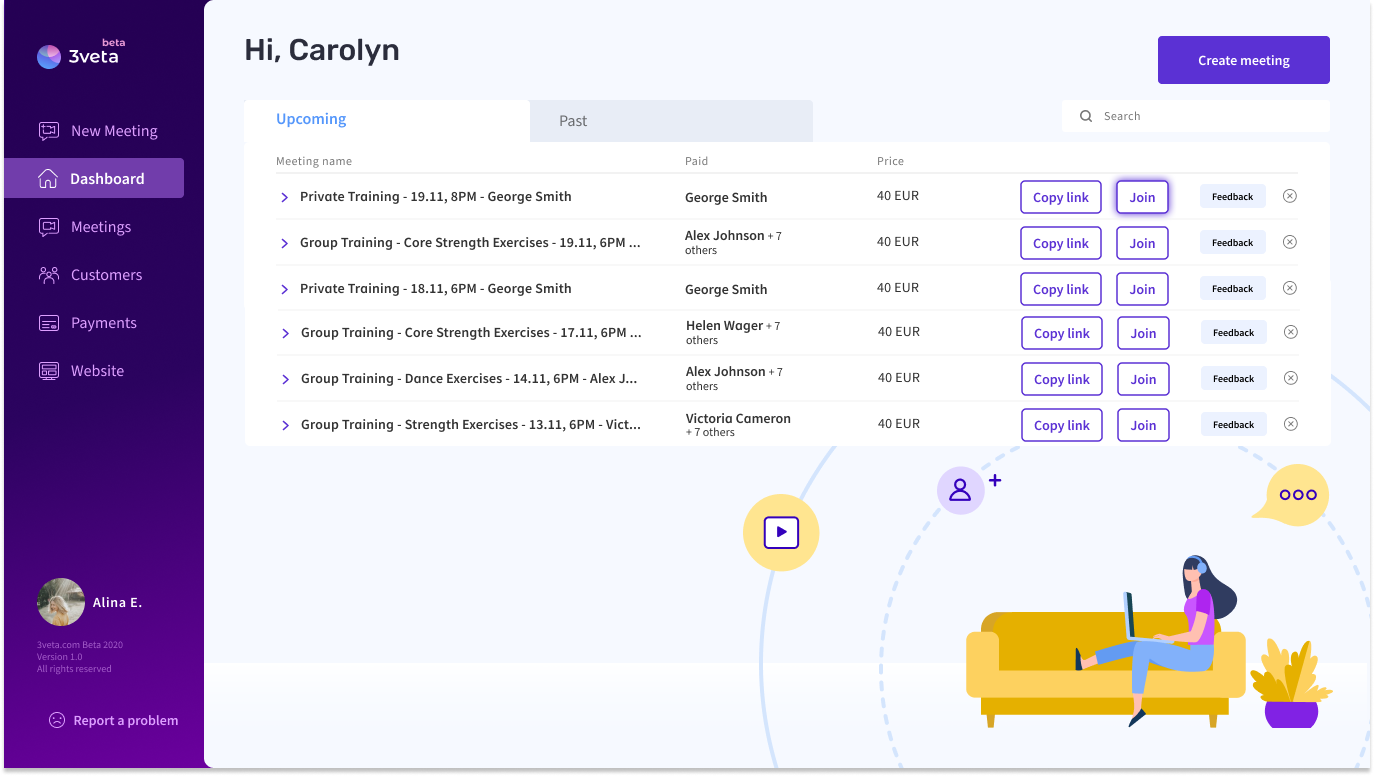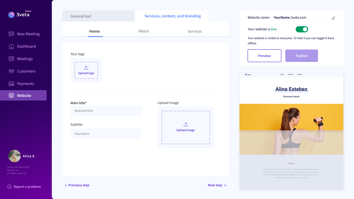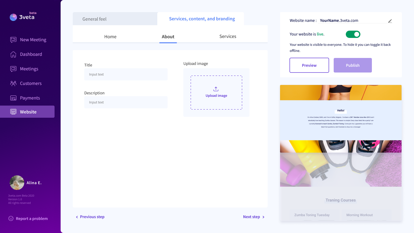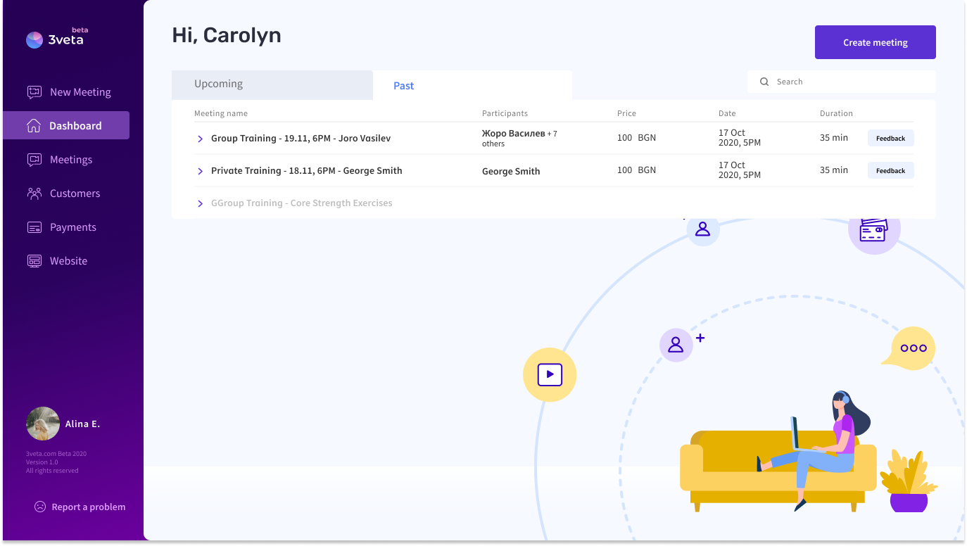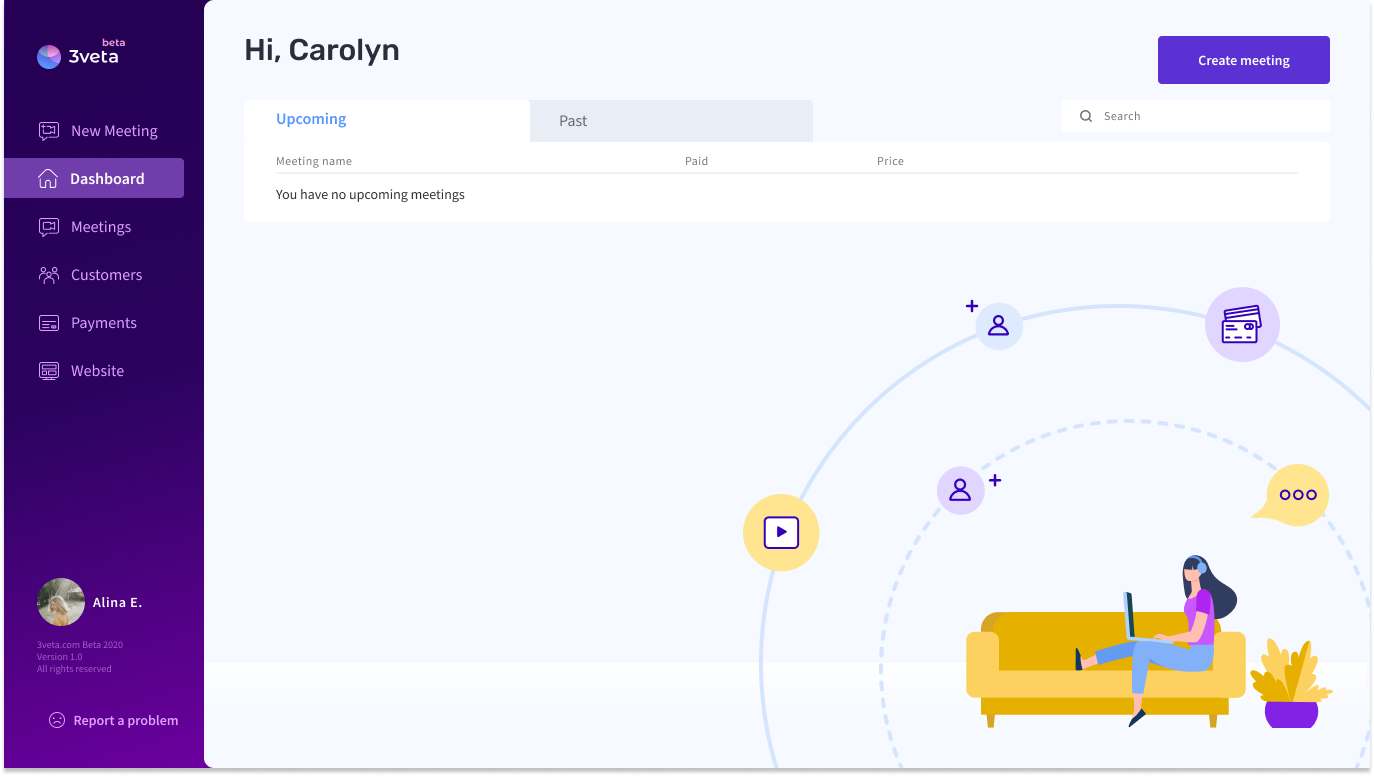 3veta is an end-to-end solution aiming to digitalize the world of services. Not everyone can be tech-savvy or have the resources to create their own platform where they can host video meetings and get paid. We wanted to change that. So we made it extremely easy for anybody to create their own platform, with their own branding, where they can provide online consultations and get paid. With 3veta you can: - Host video meetings with clients (free or paid) - Receive secure payments prior to a meeting - Keep track of all your clients and transactions - Have all meetings happen on your own subdomain (e.g. FirstnameLastname.3veta.com) - (optional) Create a presentational website where you can showcase your services (e.g. yourname.3veta.com) - Sync your calendar and schedule meetings