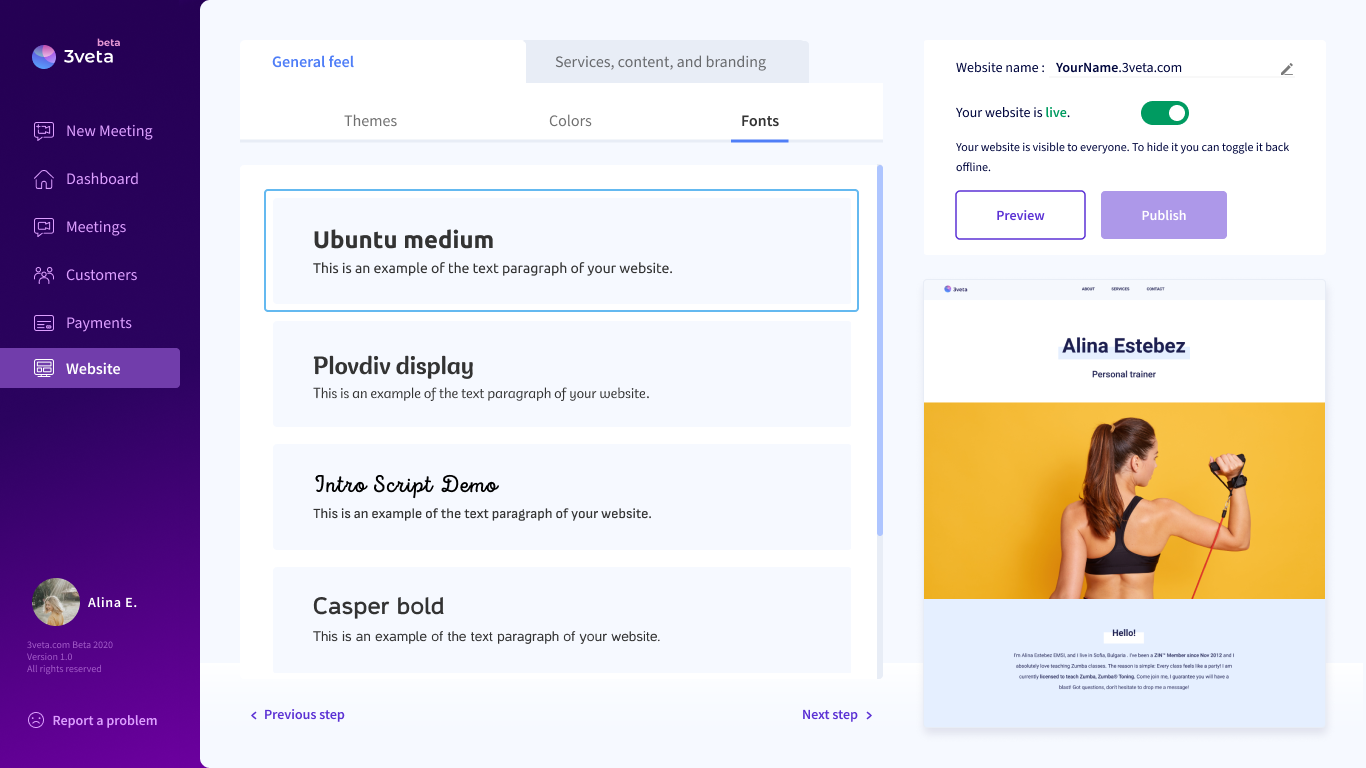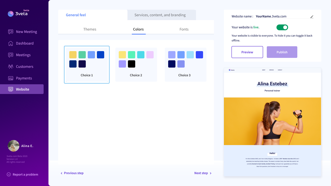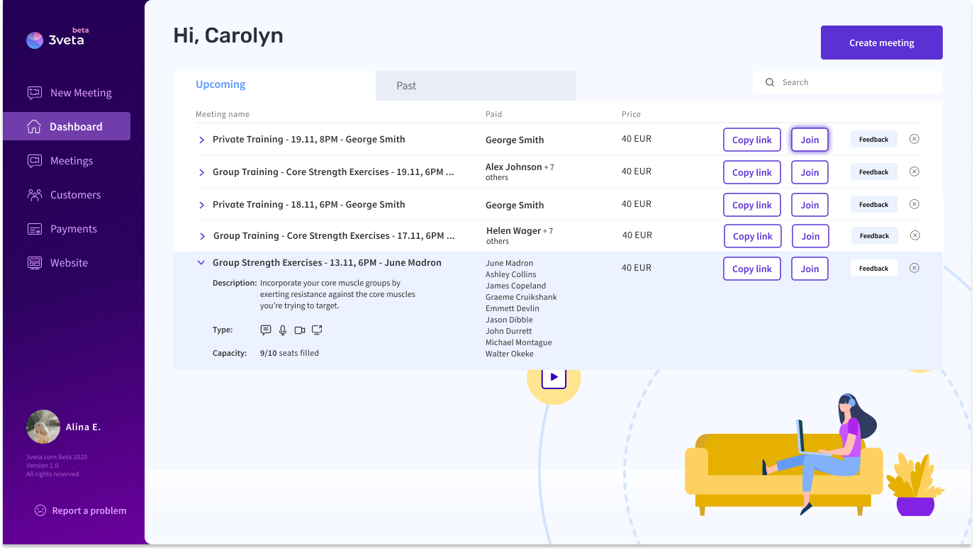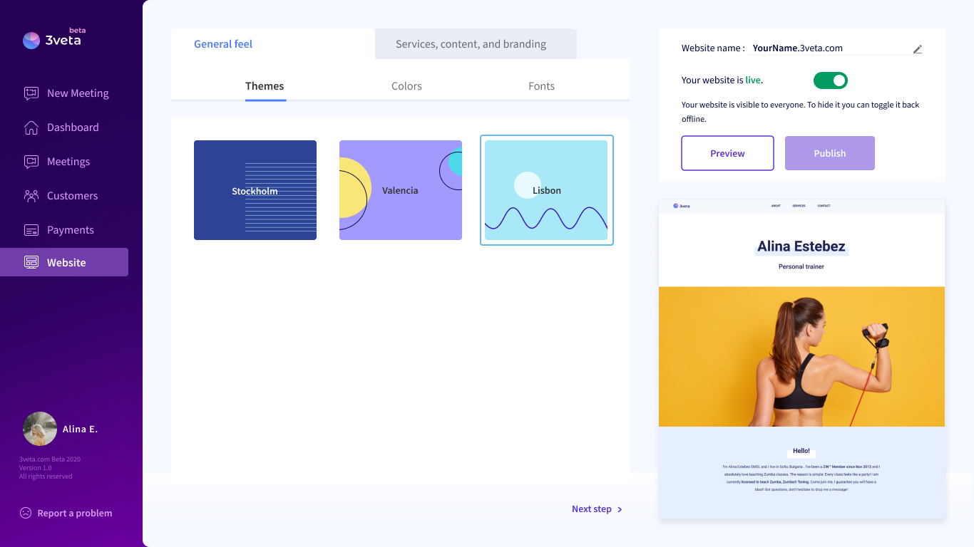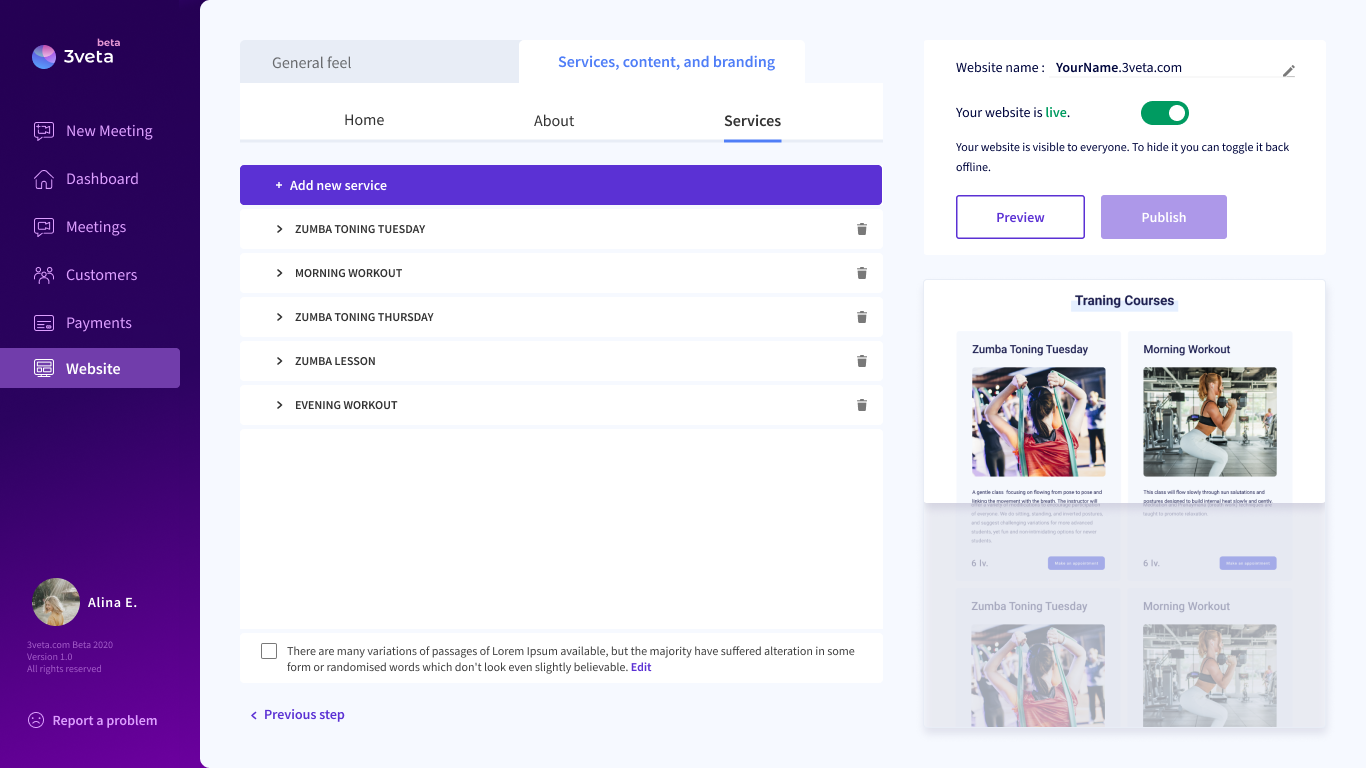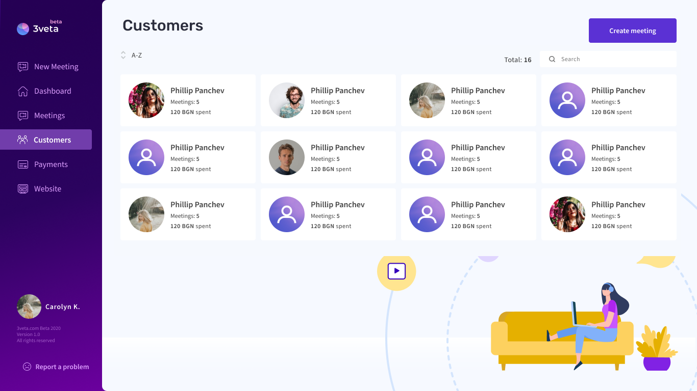 3veta is an end-to-end solution aiming to digitalize the world of services. Not everyone can be tech-savvy or have the resources to create their own platform where they can host video meetings and get paid. We wanted to change that. So we made it extremely easy for anybody to create their own platform, with their own branding, where they can provide online consultations and get paid. With 3veta you can: - Host video meetings with clients (free or paid) - Receive secure payments prior to a meeting - Keep track of all your clients and transactions - Have all meetings happen on your own subdomain (e.g. FirstnameLastname.3veta.com) - (optional) Create a presentational website where you can showcase your services (e.g. yourname.3veta.com) - Sync your calendar and schedule meetings