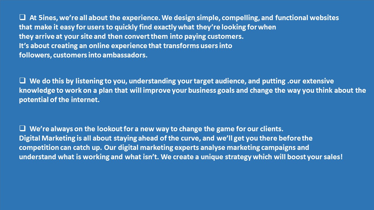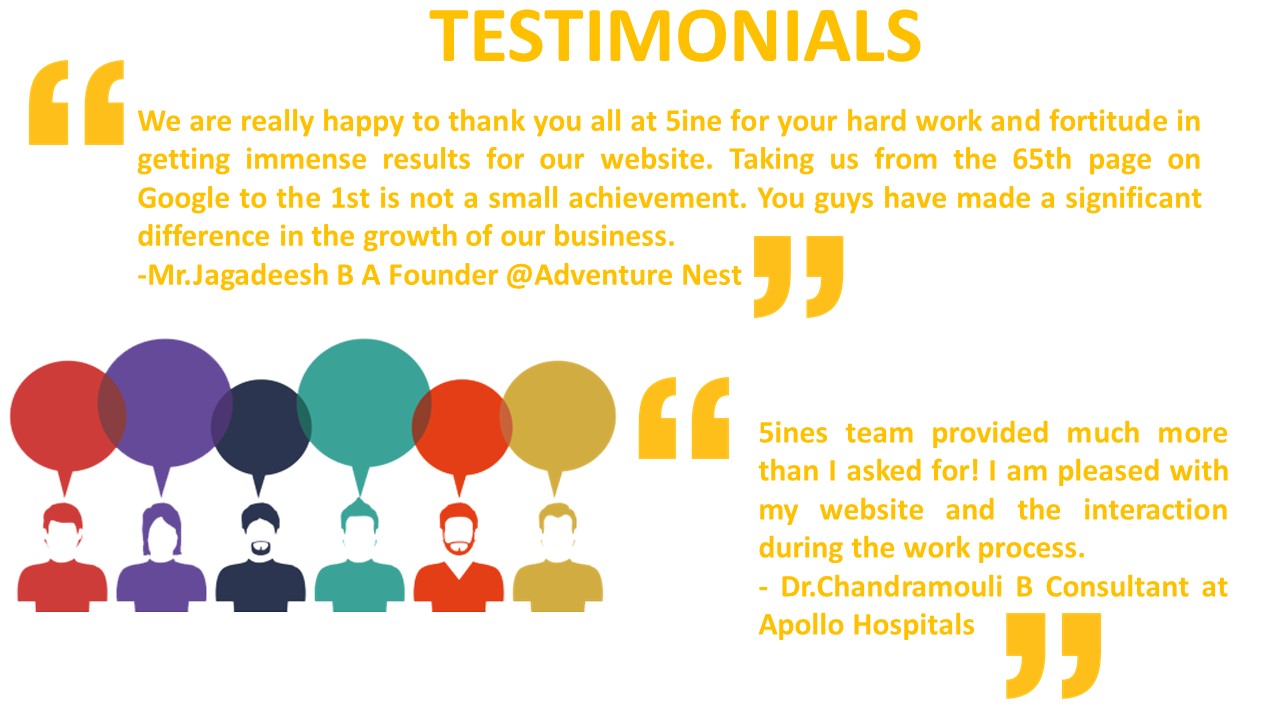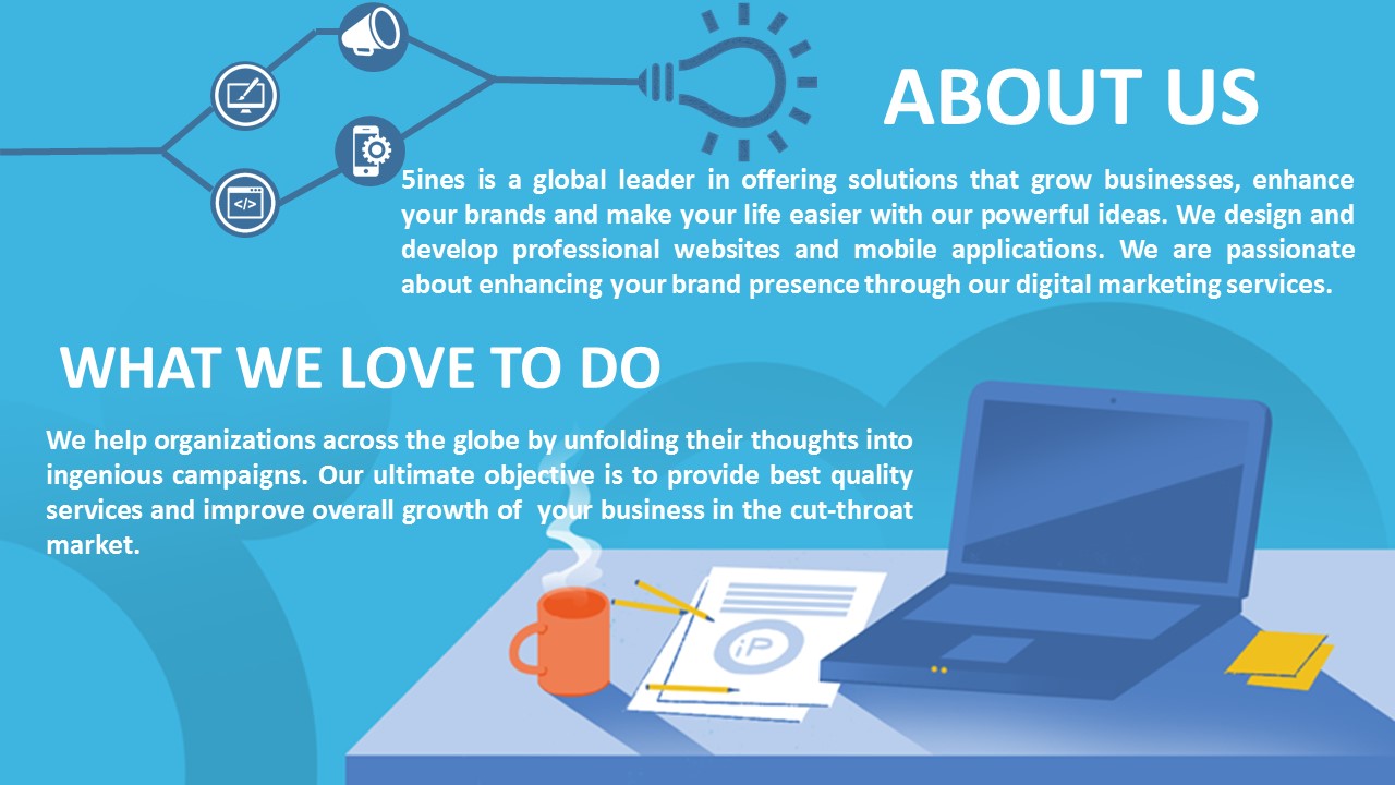 Welcome to 5ine Web Solutions-Enhancing Business with pioneering thoughts. 5ine Web Solutions is one of the leading global Web design services in Bangalore. We have years of experience and are experts in Web designing and development, Digital marketing and App development. We have completed more than 90+ projects on all our services. We are passionate about crafting powerful websites that will enhance your brand presence online. Our services: Web Design & Development, Digital Marketing Services, Mobile App Development Our passionate team of web designers will craft websites that are visually appealing, polished and professional. http://www.5ines.com