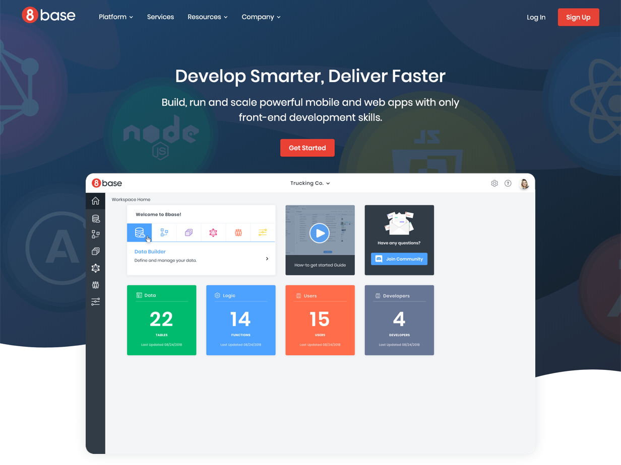 About 8base: Developer Acceleration Platform that empowers developers to build, run and scale powerful mobile and web apps with only front-end development skills. 8base lets front-end developers create new business applications 10x faster without relying on back-end developers and DevOps. Product Differentiators: Developer acceleration platform, Low-code, BaaS, GraphQL, Serverless, Autoscaling, Role-Based Access Controls, SDK, UI Kit, Command Line Interface, Data Modeling, File Store, Document Management, Redundant, Fault-Tolerant, Pub/Sub, Extensible