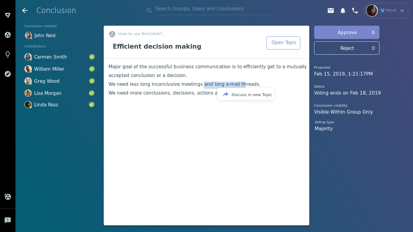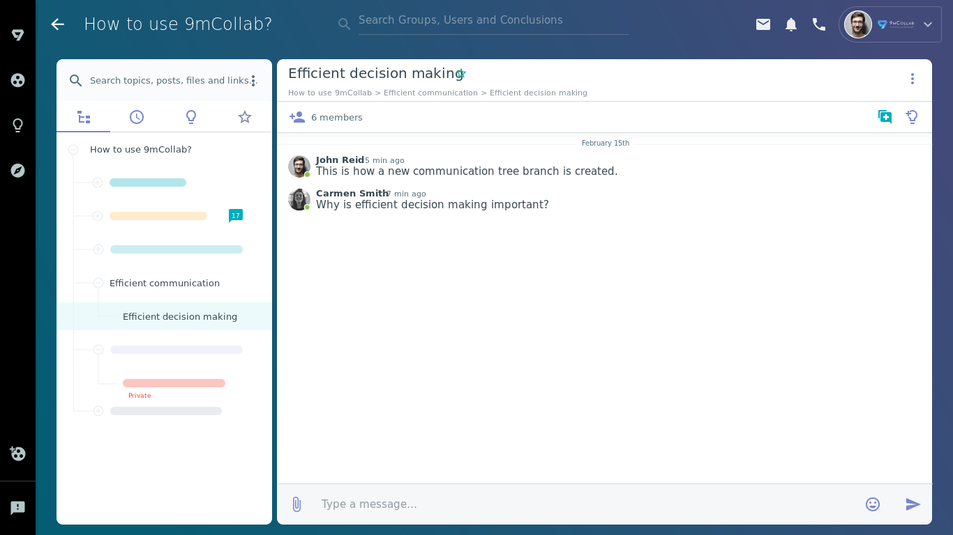 9mCollab is an organization management tool that enables logically structured, conclusion-driven collaboration. It’s built for organizations and team members to enjoy conclusive discussions and faster decision making with less information noise and distraction. It helps to translate the results of communication into a valuable knowledge base. Efficient communication Discuss essential topics through non-linear chat, share files, and organize productive meetings through video calls. Nonlinear Chat (NLC) model enables thread branching whenever the main topic is changed. It allows some users to discuss specific details without interrupting the flow of the original discussion. We make sure you receive only needed info and share it exclusively with relevant people. Via the NLC model, communication is graphically presented in a communication tree with an unlimited number of branches so everyone in the workgroup can understand the origins of particular topics and focus only on ones that are of your interest. Productive collaboration Propose a conclusion as a result of the topic discussion. Capture all crucial bids and prevent information loss. Conclusion Driven Collaboration (CDC) model drives users to the result of the communication - mutually accepted, quickly voted, adjustable, searchable, and shareable conclusion. We enable any user to gather all relevant stakeholders and propose a Conclusion on any particular topic on the communication tree. Approved conclusion represents the current standpoint of the majority of discussion participants or all of them, depending on if the vote was a majority or a consensus vote. Whenever the conclusion is proposed, the dynamics of the discussion change because participants focus on a particular solution, and the conversation becomes far more productive. Knowledge sharing Organically - via everyday communication and conclusions/decisions which come out of it - build the internal or external knowledge base. The part when users share their workgroup conclusion into an internal or external knowledge base is an integral part of our 9mCollab dynamics that transfers results of the communication in the knowledge base, accessible to everyone in the organization.