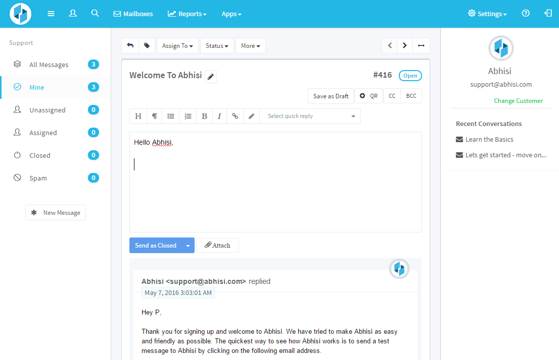 Abhisi lets you provide timely personalised support to your customers while being incredibly simple to use for you and your team. If you are using Gmail or other email clients give Abhisi a try and see how much time, effort and hassle it saves you. Abhisi lets you provide support from all sources - email, Twitter, Facebook and more - to make your team's life easy and your customers happy. Because happy customers grow your business.