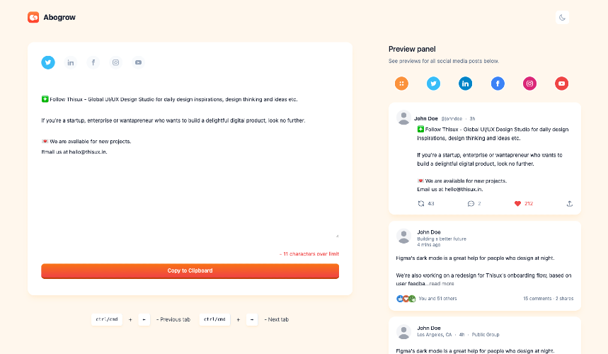 Abogrow is a AI content suggestion tool that helps you write, preview, post and collaboratively manage your content. It also helps you to scale your brand!