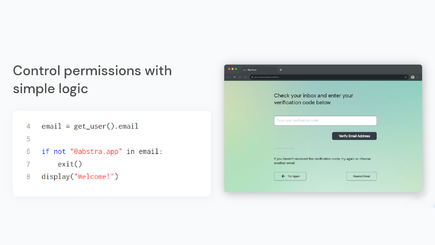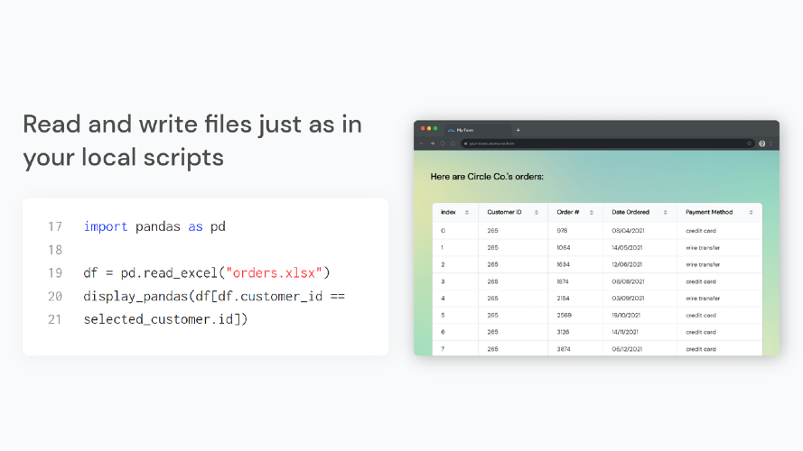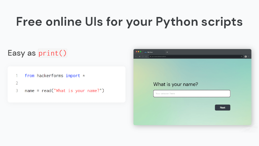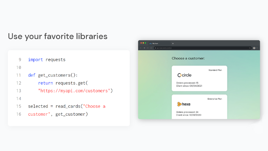 With Abstra Cloud, your Python scripts become web apps ✨automatically✨. Code Python as you would in the terminal, and our lib transforms your commands into beautiful UI. Test locally and in a single click deploy it online, hosted in a custom subdomain. Use all your favorite Python libs and logic for maximum building flexibility - and minimal building time. Abstra Cloud is great for creating internal tools, such as registration portals and onboarding flows, and project MVPs.