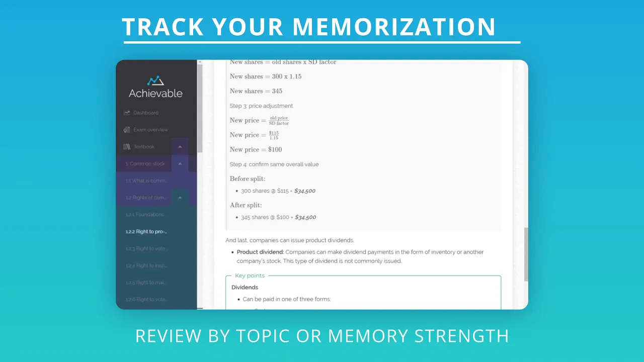 A test is all that stands between you and your goals, and Achievable is your tool to conquer it. We're the only company that uses advanced memory science technology to ensure you reach your target score. Achievable offers complete digital test prep courses built for the modern student. As they study, our algorithm tracks your studying and memory progress to deliver a personalized experience, reducing the study time required to reach your target score. Bit by granular bit, Achievable reinforces what you know and trains you on what you don’t - until you're ready to hit your goal.
