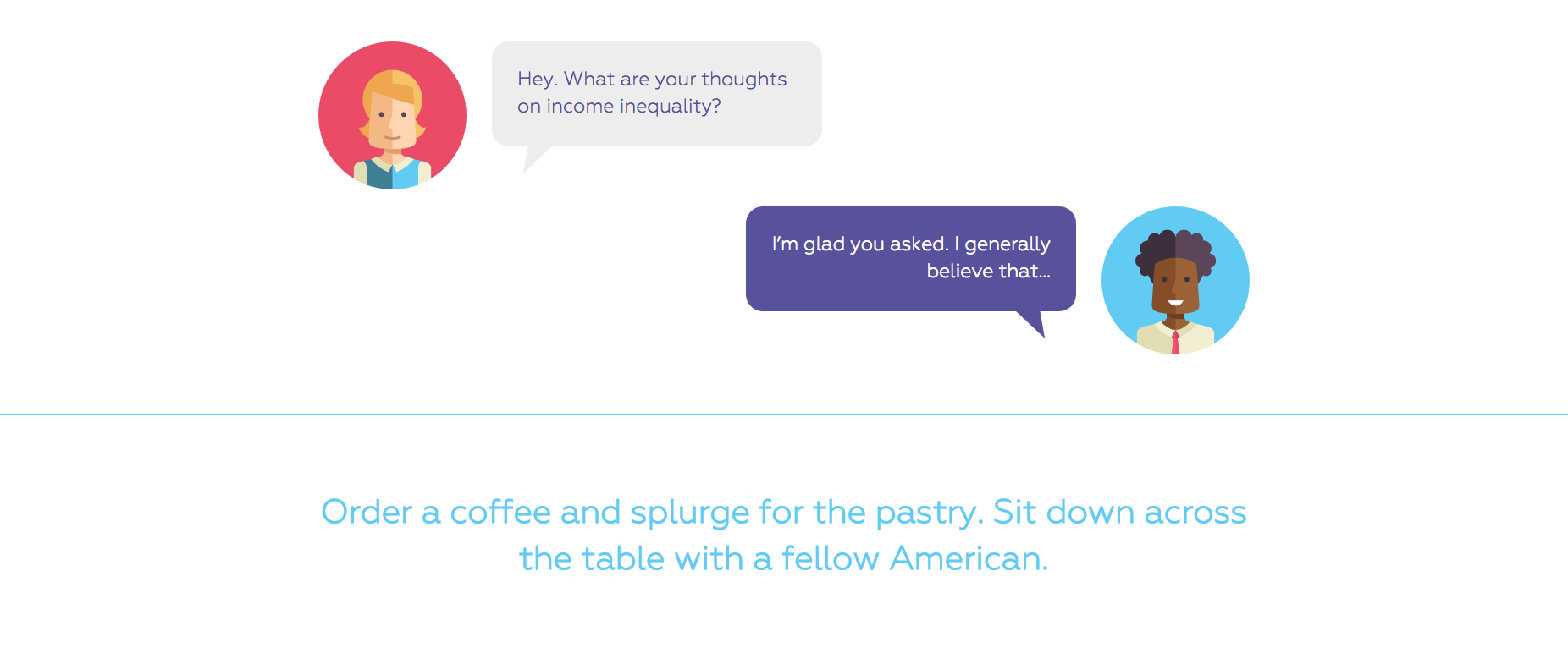 Our nation has never felt more divided. Our interactions with those who are different from us have become limited. It feels like every social and political issue is polarizing, our civil discourse is clouded with contempt. But our Founding Fathers knew the value of an open dialogue with all sides. We are all Americans. Our differing opinions are simply a reflection of our different experiences and personalities. Let’s end the hate and reinvigorate the art of respectful political discussion. We should never forget that what we have in common outlives elections, endures through tragedy, and rises above social unrest. --- Across The Table is a community that aims to help heal the divide. Our free web service makes it easy to schedule a one on one chat with someone who thinks differently than you.