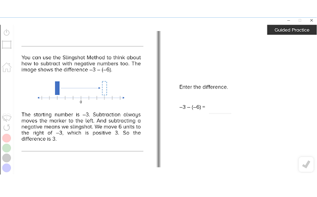 NEW 2.0 version contains 3 lessons, including the original, assembled into modules. Guzinta Math: Add and Subtract Negative Numbers focuses on practice with integer addition and subtraction, including solving word problems by applying addition and subtraction of negative numbers. For one-on-one or whole-class mathematics instruction, use this Guzinta Math lesson as a supplement for teaching about adding and subtracting negative numbers--a key concept in 7th grade. The app includes detailed instructor notes for each guided practice problem, with notes about extending discussion around each worked example and problem. This lesson includes an interactive number line tool, demonstrating the Slingshot Method of adding and subtracting with negative numbers. Students can use the tool to calculate integer sums and difference, but more importantly they can use the tool to gain fluency in thinking about how adding and subtracting negatives work on the number line.