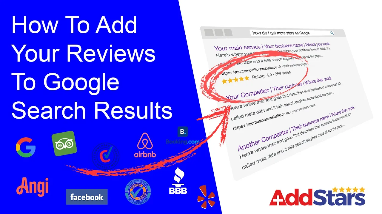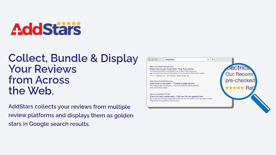 Get noticed on Google and drive more visitors to your website. AddStars collates and displays ALL your reviews as yellow stars on Google – right where your potential customers will see them. On average, this means a 35% increase in clicks through to your website. That’s right, ALL your reviews from across platforms such as Google, Facebook and Yell are collated and displayed as golden yellow stars on Google’s search results. Imagine the advantage you would have over your competitors by displaying all your reviews right where your potential customers are searching...on Google. AddStars is not a review platform like Trustpilot, and it's not a review management service that lets you show your reviews on your website. AddStars is different! AddStars is the only tool that exclusively collects your reviews from multiple review platforms from across the internet, bundles them together, and displays them as a total on Google Search results. How AddStars will help your business get more quality enquiries from the internet… 1. Make your web pages stand out from the crowd with golden-yellow stars. 2. Get a higher click-through rate (on average 35% more!!) 3. All your reviews are shown as a total next to your web pages on Google. 4. Boost customer confidence in your business. 5. Influences a higher ranking on local search results. Use it yourself or become an Affiliate or Reseller What better way to make your business or service stand out from the crowd than to collect your reviews from all your favorite review platforms and show them right where your potential customers are looking -- on Google's search pages? You might have dozens or even hundreds of reviews scattered over the web, but they can go to waste if your customers don't know they exist. Why wait for customers to visit your website to show them off? Why not take them and put them on Google's search results pages -- the place 92.8% of people visit when looking for a service just like yours?