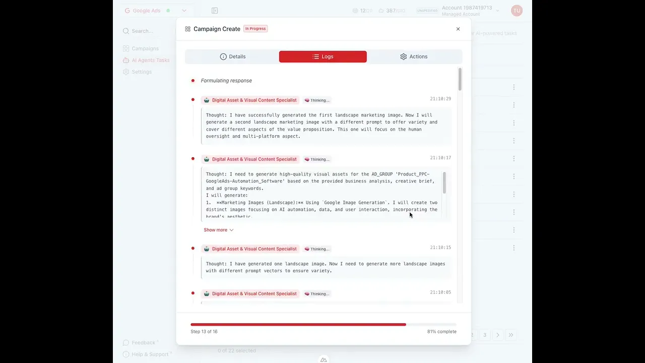 Launch and Optimize profitable campaigns at Google Ads, completely handled by Multi-Agent AI fully equipped with the required tools. Connect your ads account, fill in the basic campaign's traits, description of the target product and users - get a unique campaign generated on each run, with multiple ad groups with ads / asset groups for Pmax. Most likely one of the first vertical solutions of the multi-agent complex workflow made into SaaS.
