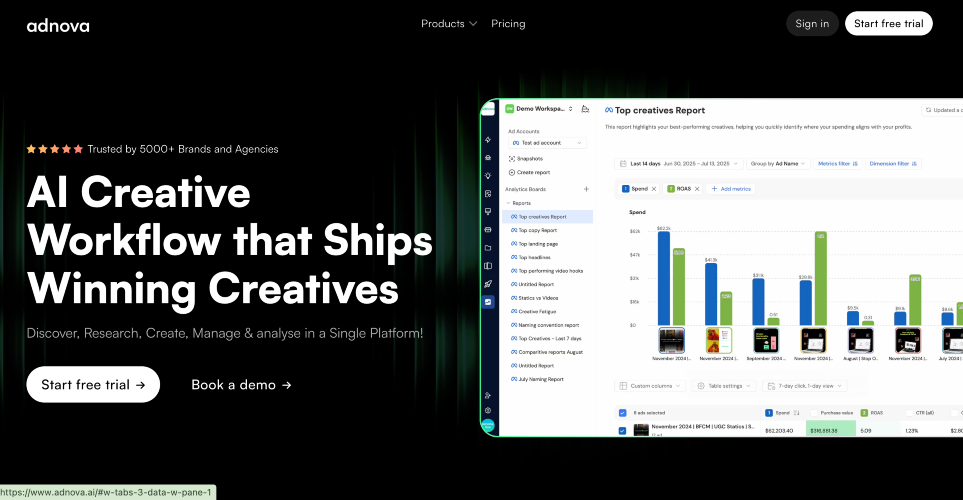 Adnova.ai is the all-in-one AI creative workflow platform built for performance marketers, brands, and agencies. From discovering winning ad ideas across a library of 75M+ ads to tracking competitor creatives, analyzing what's working, managing assets, and bulk-launching 100+ ads in a single click — Adnova replaces 7+ tools and brings your entire ad creative process under one roof. Trusted by 5,000+ brands worldwide.