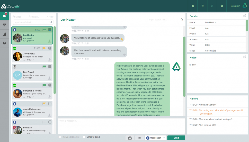 Adsoup is an Omni-channel sales CRM, Unifying Multiple messaging services, email and livechat into a single, easy to manage dashboard. If you're a creative agency, marketing your services on multiple social channels, your customers expect you to be everywhere at all times because when they have a question, they want an answer fast. It's impossible to stay on top of it all and If you do, you lose critical information jumping from one platform to another, or even the sale itself! Not to mention, how do you track the return on your advertising spend when you're using multiple tools? Complicated spreadsheets? third-party applications? We understand the problems you face, we come from an agency background, and were battling the same issues ourselves! That's why we built Adsoup, it combines all these services into a single dashboard, where you or your team can instantly respond, no matter what channels your customers prefer to use.