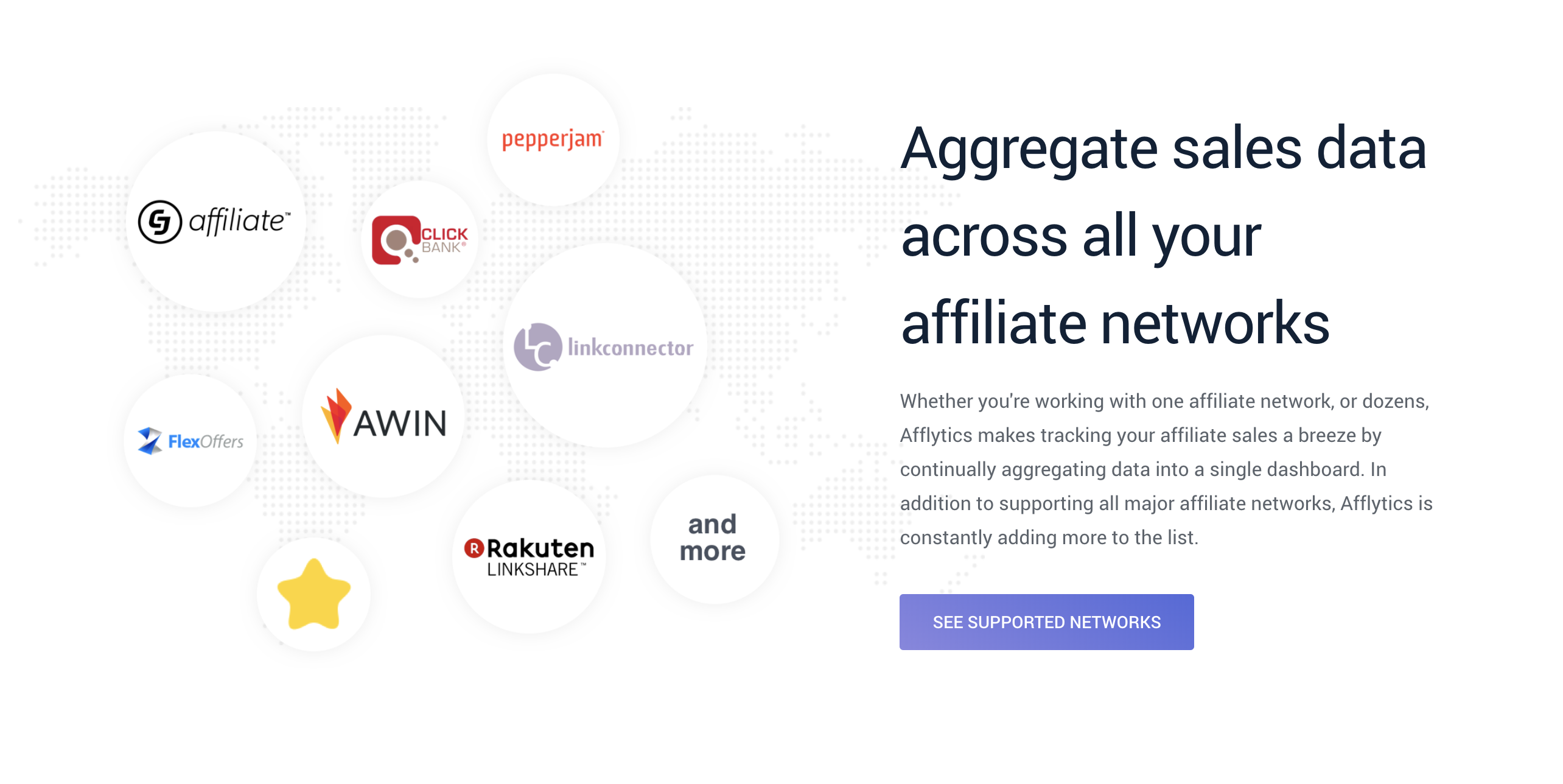 Afflytics - Affiliate Analytics Dashboard. Put your affiliate marketing on autopilot. Afflytics tracks and analyzes your affiliate income by connecting all your affiliate networks in one place. * Aggregate sales data across all your affiliate networks. Whether you're working with one affiliate network, or dozens, Afflytics makes tracking your affiliate sales a breeze by continually aggregating data into a single dashboard. In addition to supporting all major affiliate networks, Afflytics is constantly adding more to the list. * All your affiliate income on a single dashboard Grow your affiliate marketing business by using Afflytic's comprehensive sales metrics to pinpoint trends and discover new marketing opportunities. * Tools for affiliate marketers, from bloggers to agencies. Afflytics provides the tools to help every affiliate marketer maximize their full potential.