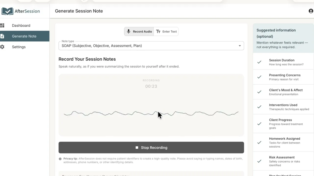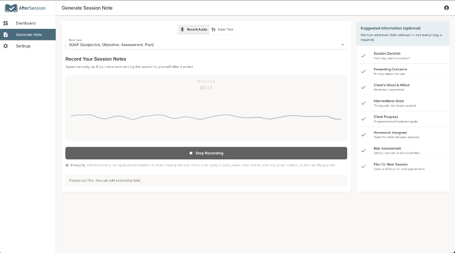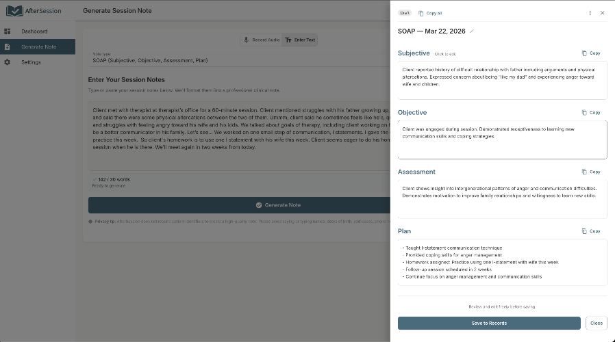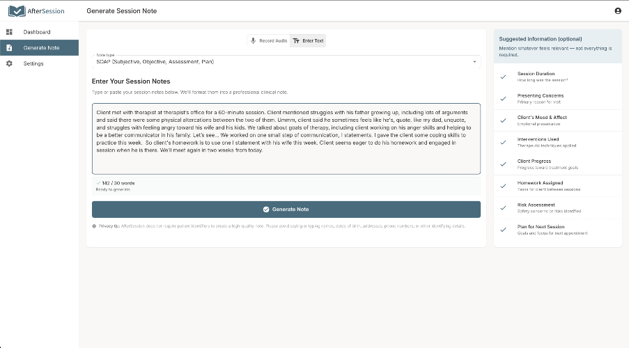 AfterSession helps therapists reduce the time and friction involved in writing clinical notes. Most documentation tools focus on writing faster. But from what we’ve seen, the biggest challenge isn’t writing — it’s getting started. After a full day of sessions, that blank page is where time gets lost. Once a therapist begins summarizing the session, the rest usually flows. AfterSession is designed around that insight. Instead of recording sessions or requiring a full transcript, therapists can enter a brief written or spoken summary after a session. From there, AfterSession generates a structured note in formats like SOAP, DAP, or BIRP within seconds. The goal isn’t to replace clinical thinking — it’s to reduce the friction between reflection and documentation.