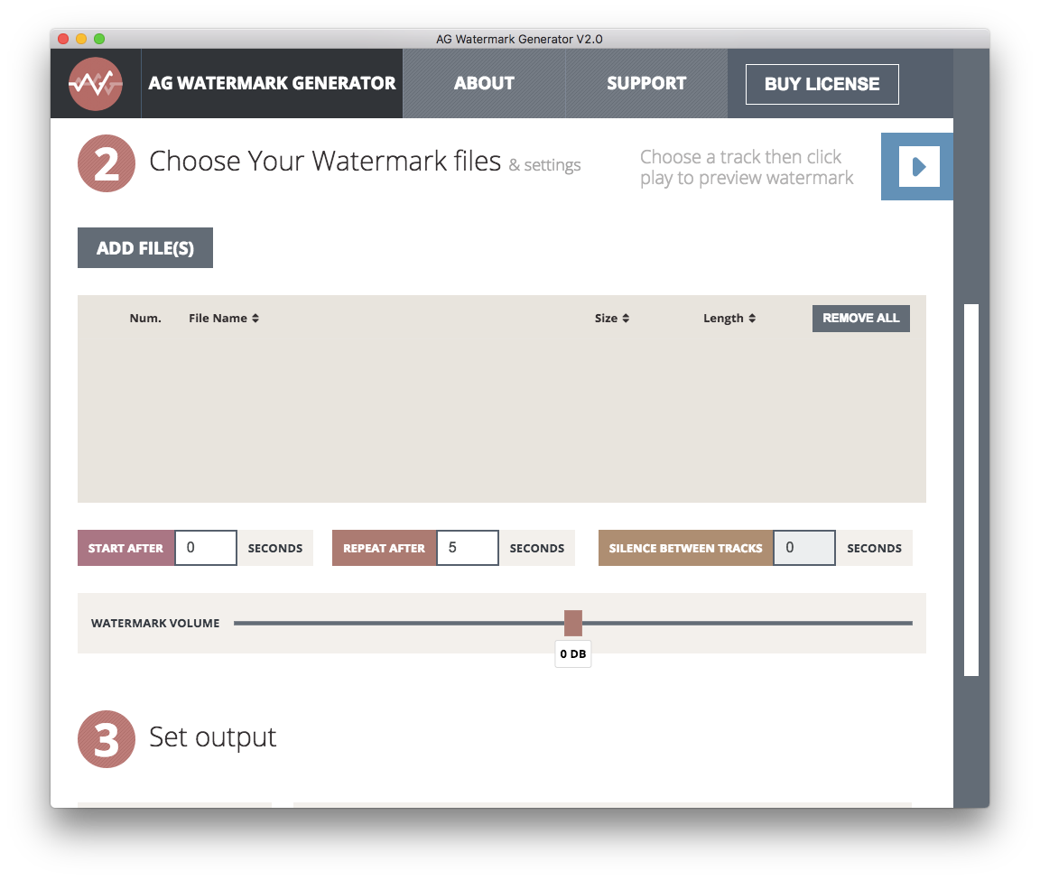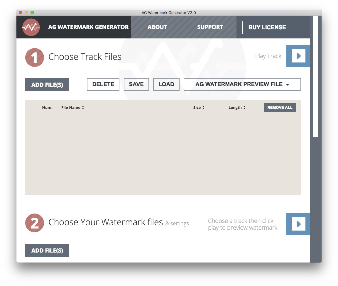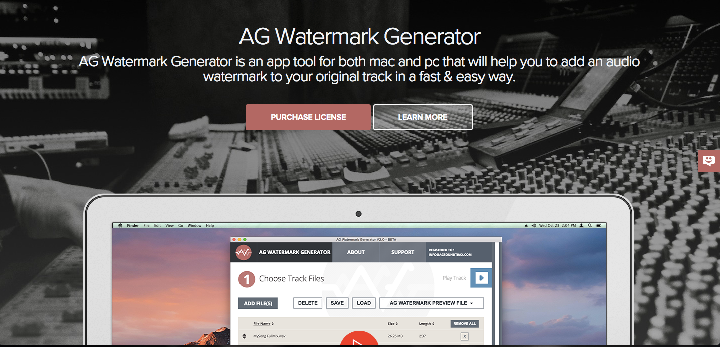 Hi All, We really excited to bring you our V.2 release for the 'AG Watermark Generator'-The 'AG Watermark Generator' tool is an app tool for both mac and pc that will help you to add an audio watermark to your original track in a fast & easy way. So what’s new in V.2? - Totally fresh new UI and design. – Faster file processing. – Process progress bar. – You can now change your watermark’s volume. – Preview how your watermark will sound before processing your files. – Quick player for the watermark files. – Stop and cancel AGwatermark’s process at any time. – Now accepting watermark files that are longer than 15sec. – Choose the same output folder with one click. – Drag and drop file order. – Change tracks order by sorting by size/length/file name – Suggest Ideas section. – Override files alert. – Alert messages are now more detailed. – Play sound notification when a process is done.