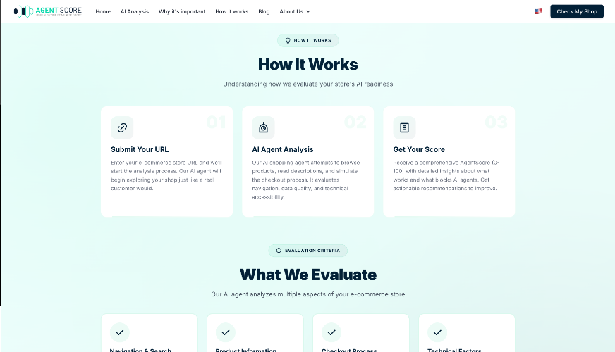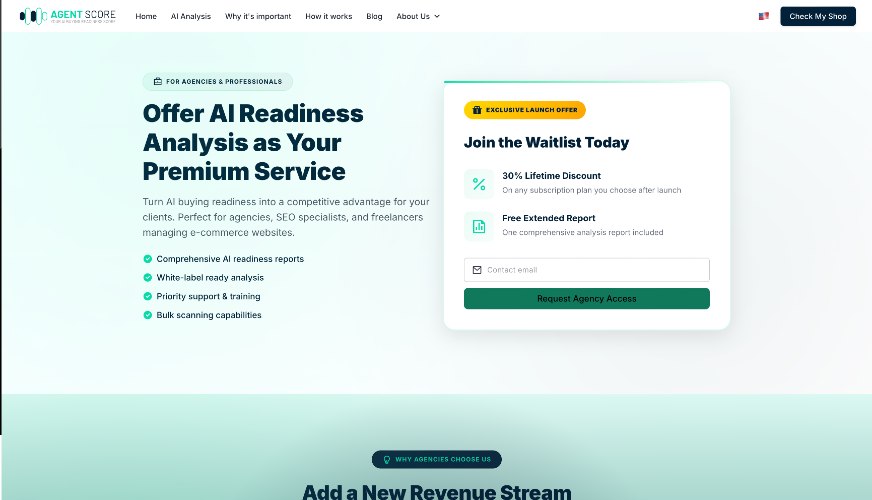 AgentScore helps businesses understand how ready their websites are for AI agents and autonomous shopping. As AI agents increasingly assist users with research, comparison, and purchasing decisions, traditional SEO and UX metrics are no longer enough. AgentScore introduces a new way to evaluate websites — from the perspective of AI agents. Instead of focusing only on rankings or traffic, AgentScore analyzes whether an AI agent can understand, navigate, evaluate, and complete actions on a website, such as product selection or checkout. What AgentScore does AgentScore evaluates websites using an Agent Readiness framework, focusing on areas like: • structure and machine-readability • clarity of product and pricing information • decision-making signals for AI agents • friction points in navigation and conversion flows The result is a clear Agent Readiness Score with actionable insights. Who it’s for - SEO freelancers & consultants Gain a new competitive angle beyond traditional SEO audits. - Agencies Add AI-readiness audits as a new service for e-commerce and digital clients. - E-commerce teams Understand why AI agents struggle to evaluate or purchase from your store — and how to fix it. Why it matters Most websites are optimized for humans and search engines — but AI agents behave differently. AgentScore helps you prepare for a future where AI agents increasingly influence buying decisions, recommendations, and automated purchasing. Early access AgentScore is currently in pre-launch. Early adopters get: • free early access • a full detailed Agent Readiness report • priority support • the opportunity to influence scoring methodology Early access is limited to the first 100 users.