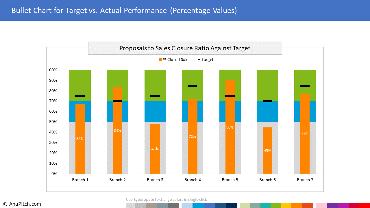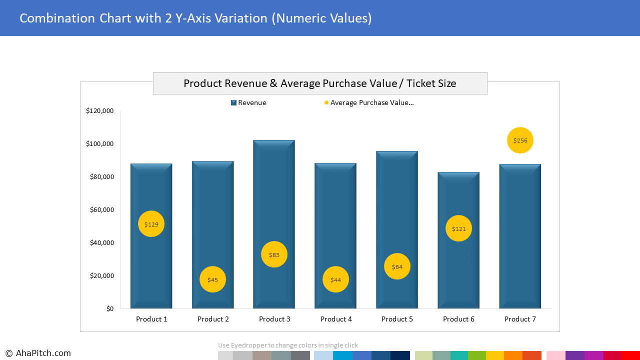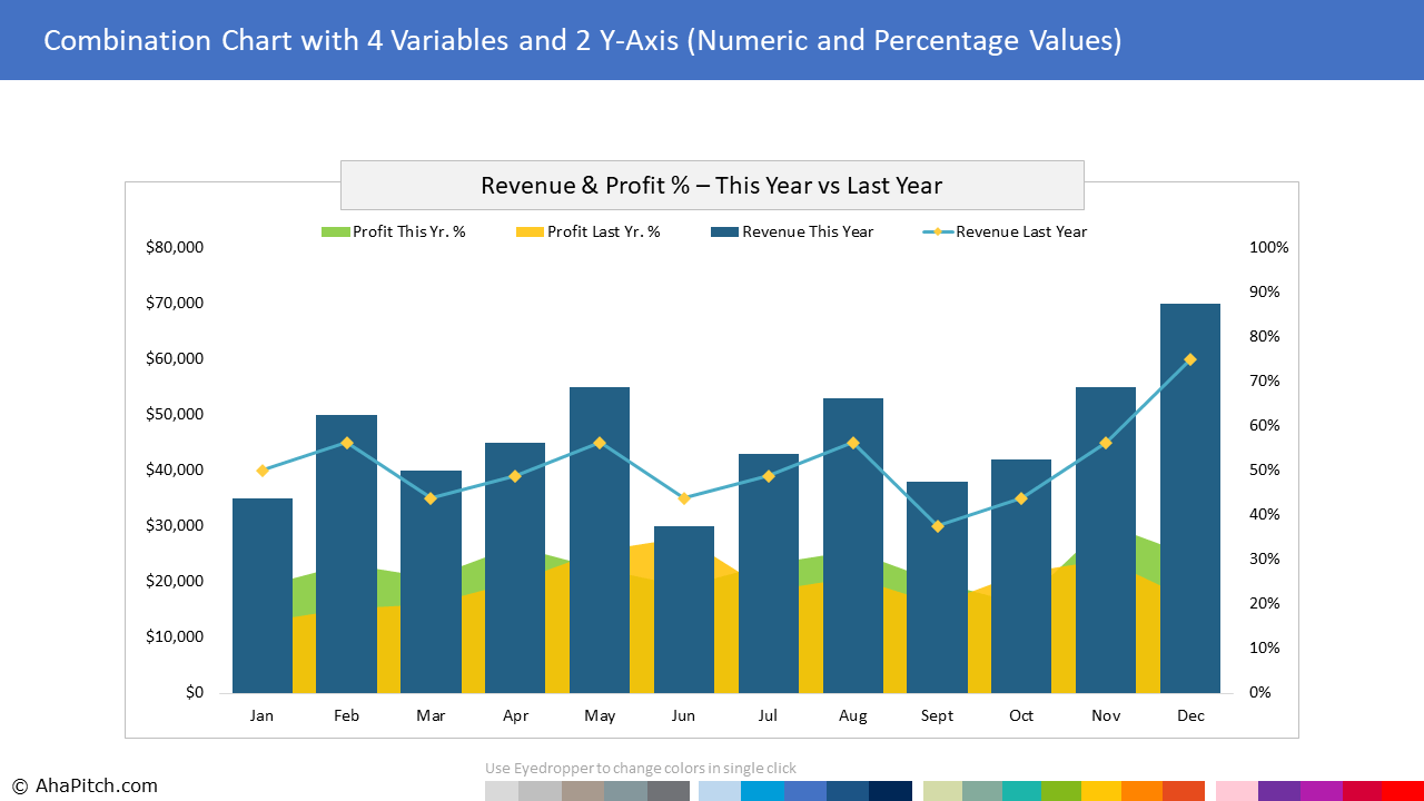 AhaPitch offers beautiful, improvised and professionally formatted PowerPoint chart templates that make the process of creating charts easy and fast. Spend less time on creating charts and more time doing the work you love. Brilliant data analysis often falls short of making an impact if the findings and insights can not be communicated effectively to the target audience. Your data presentation can be a deal maker or a deal breaker. The stand out professionals not only possess strong analysis skills but are also great at storytelling with data. On the other hand, novice professionals simply paste charts from native platforms into PowerPoint. Some spend hours to create charts in Excel and then paste them as images in PowerPoint. The problem with both these approaches is; even a minor change in data, labels, annotations, colors or fonts leads to back and forth corrections, duplication of work and wasted time. And if any anomalies go unnoticed, it results in inconsistent styling with rest of the PowerPoint, often enough to distract clients and make an important presentation look unprofessional. You don’t want to mess up your brilliant analysis with unappealing charts, do you? What if you could create any data chart directly in PowerPoint, in minutes rather than hours. There has to be a better way. That’s why we created this library of professionally pre-formatted, 100% data driven, ready-to-use chart templates for PowerPoint, so that you can create professional reports, dashboards and presentations quickly and deliver a visual experience that will resonate with the audience.