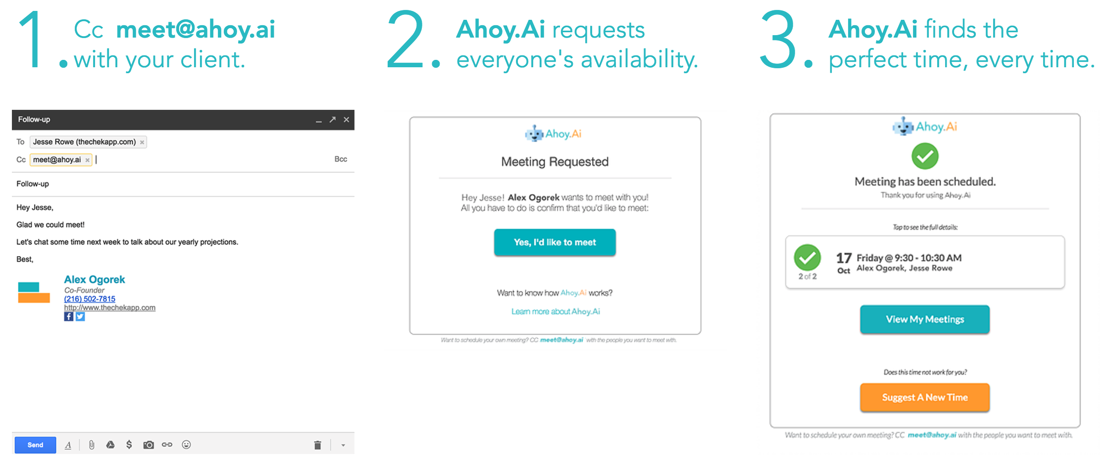 Ahoy.Ai automatically schedules and manages meetings for you with just 1 email. Rather than solving the problem of scheduling meetings like x.ai, Clara Labs, and Julie Desk, we wanted to eliminate the entire process. To schedule your next meeting with Ahoy.Ai simply cc "[email protected]" in the email.