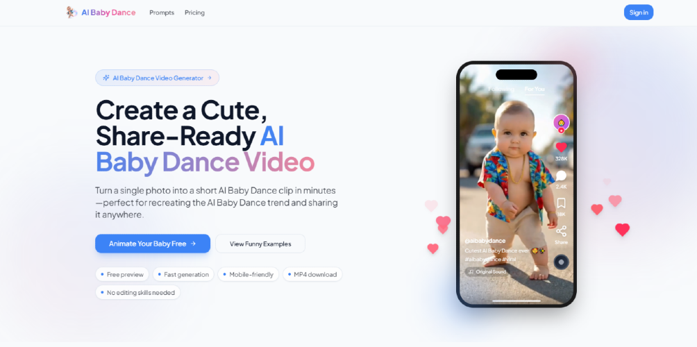 AI Baby Dance is a browser-based AI video generator that turns a single photo into a dancing video. It includes dance templates, free preview/sample runs, MP4 export, and supports 720p/1080p output. The site also states it is powered by Kling AI motion control for smoother motion.