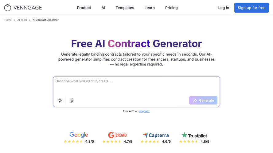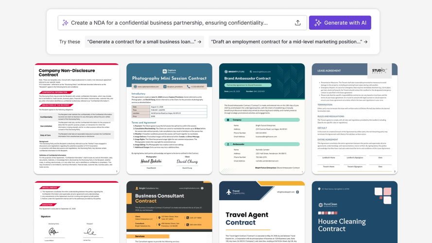 The AI Contract Generator helps businesses and professionals draft clear, structured contracts using simple prompts. Built to support accuracy and consistency, it creates editable contract drafts aligned with common legal document formats, saving time while maintaining professional standards. Key Features - Prompt-to-Contract Generation: Create contract drafts by entering key details such as parties, scope, and terms. - Standard Contract Structures: Automatically organizes content into commonly used legal sections and clauses. - Auto Branding: Apply your brand colors, fonts, and logo automatically to keep contracts visually consistent. - Editable Contract Content: Review, modify, and customize clauses to match specific business needs. - Clear, Professional Language: Uses formal, easy-to-read wording suitable for business and legal contexts. - Reusable Drafts: Adapt contracts easily for different projects, clients, or use cases. Benefits - Faster Contract Drafting: Create structured contract drafts in minutes instead of starting from scratch. - Consistent Brand Presentation: Ensure every contract reflects your brand identity automatically. - Reduced Formatting Errors: Follow standardized layouts and sections without manual setup. - More Confidence for Non-Legal Teams: Enable teams to prepare clear contract drafts before review. - Simplified Review Process: Spend more time refining terms and less time on formatting and structure.