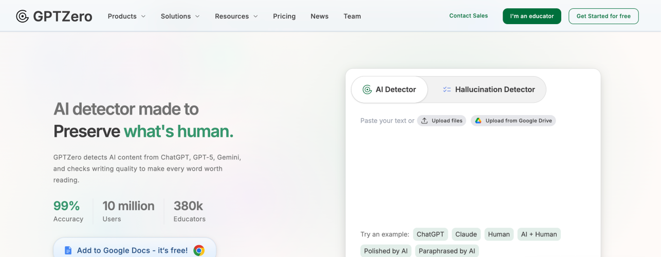 As AI-generated writing becomes more common, many people want clearer ways to understand how a piece of content was created. GPTZero is an AI detector designed to help distinguish human-written text from content produced by artificial intelligence. Instead of relying on simple patterns, it examines deeper language signals such as structure, predictability, and writing flow to form a more informed assessment. This AI detector provides both an overall classification and highlighted sections that suggest where AI involvement is most likely, giving users practical insight rather than a single score. With tools that fit into everyday writing environments like Google Docs and web pages, GPTZero is used by educators, writers, and professionals who want to check originality, encourage responsible AI use, and maintain trust in written content.