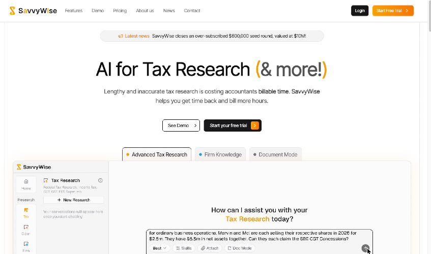 SavvyWise is an AI assistant built for Australian accountants. Initially focused on tax research, it provides accurate, cited answers within moments — so accountants spend less time searching and more time advising. Beyond research, SavvyWise supports general tasks including writing advice emails, meeting prep, and creating Excel formulas and macros.