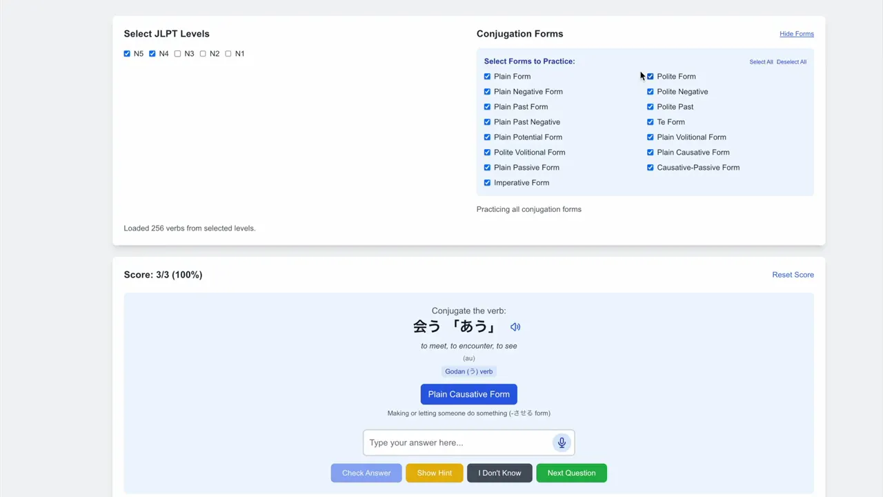 Learn JLPT vocabulary, grammar and Japanese verb conjugations with our speech recognition-based exercises. AI Japanese Tutor supports Japanese verb conjugation practice by quizzing you on random Japanese verbs and their conjugated verb forms across JLPT levels N5–N1. Speaking each conjugated verb form out loud to answer the quiz cements new patterns in your memory, boosts retention, and turns passive study into active mastery!
