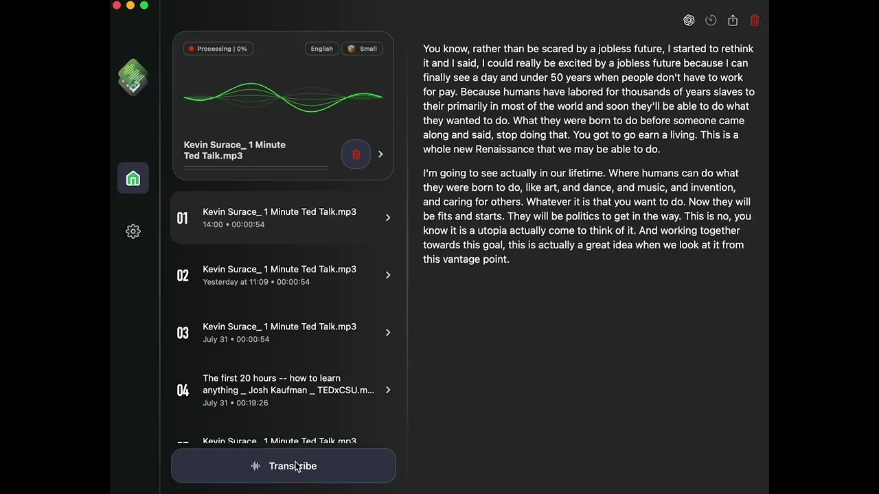 Are you looking for a privacy-safe way to transcribe audio, video, and podcast files? Do you worry about your data being leaked when you want to use AI to transcribe meeting records and improve work efficiency? AI Transcribe provides AI-powered transcription services that can run completely on-device without internet connectivity. No data is uploaded, ensuring the security and privacy of your data. ◼ Audio to Text Transcription Quickly transcribe meeting recordings into meeting summaries and convert classroom audio recordings into class notes. Eliminate the need for manual note-taking, saving time and increasing productivity. ◼ Video Subtitling Supporting various common video formats, AI Transcribe can efficiently transcribe videos into subtitles, improving the efficiency of subtitle production. No internet connection is required, and there's no need to upload videos, ensuring video confidentiality. ◼ Podcast to Text Transcription Transcribe podcasts into text, breaking the linear time constraints of podcasts and accelerating information retrieval from podcasts. Make podcasts searchable and valuable sources of information. ◼ Learn More Supported Languages: https://ai.bluepill.life/langs.html