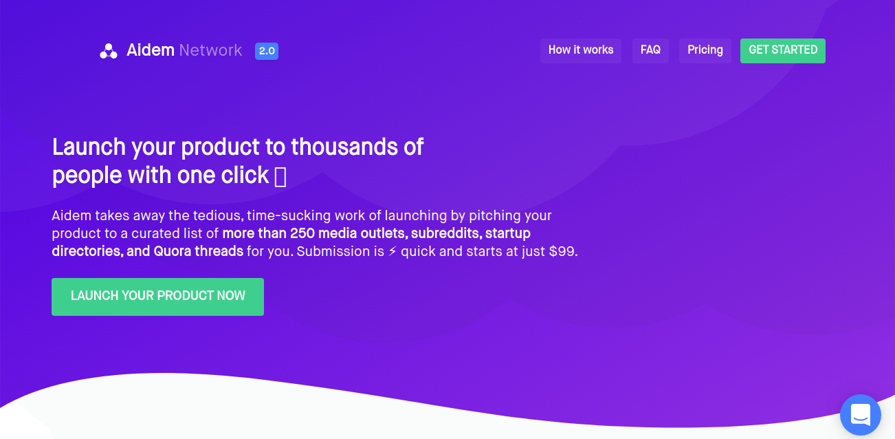 Aidem takes away the tedious, time-sucking work of launching by pitching your product to a curated list of more than 250 media outlets, subreddits, startup directories, and Quora threads for you. Submission is ?? quick and starts at just $99.