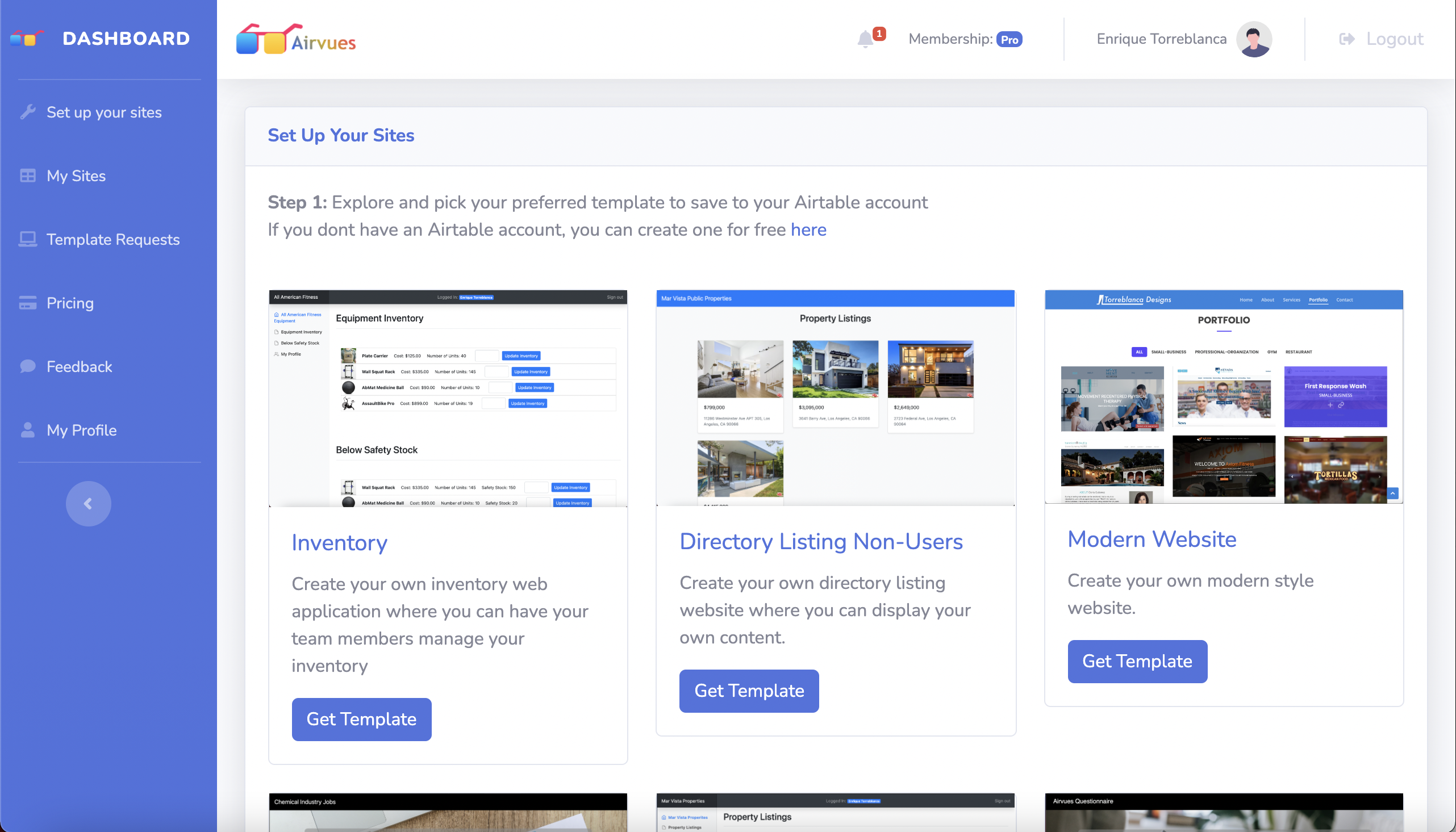 Airvues lets you build web apps using Airtable bases as the database. You can choose from a wide variety of templates and create your web app in minutes. Our goal is to increase the internet presence of individuals and small businesses with easy to build apps. Turn your Airtable base into a full functioning website or web app in minutes. Airvues is unique in that it offers simple and fast customizations with ready to go templates that anyone can edit into their own, all from Airtable bases. Currently, there are 12 templates ready to use: - Blog - Blog with users - Inventory tracker - Food ordering system - Visitor tracker - Questionnaire - Landing page - Portafolio website - Resume website - Job Board - Directory Listings - Directory Listings with users We are rolling out new templates every few week. The goal is to have a large collection of template that can fit anyones personal projects or business needs. We also offer custom template requests if none of the current templates fit your website needs. You can get started with Airvues for free or if you need more features the paid version has a 30 days free trial!