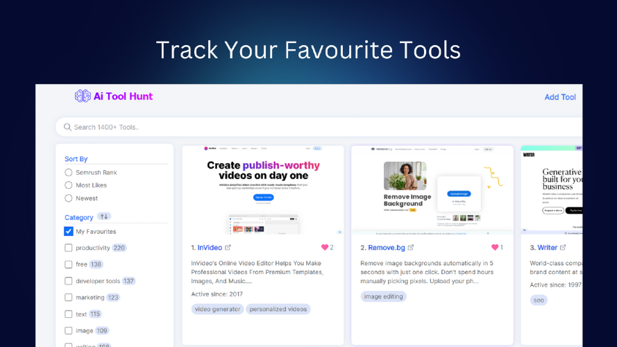 AI Tool Hunt is the go-to destination for finding the best new AI tools, best Ai Websites. Our directory is constantly updated with the latest and greatest AI tools, making it easy for users to discover and compare options for their specific needs. Exclusive Features -Apply multiple filters at once. -Sort by creation date, Semrush traffic rank, no. of likes. -Detailed Infos like global rank, website active since, location country. -User reviews, comments & discussion -Best Similar Alternative tools -Track your Favourite tools with Google Account -Easy Instant Tool Submission -Daily Ai News