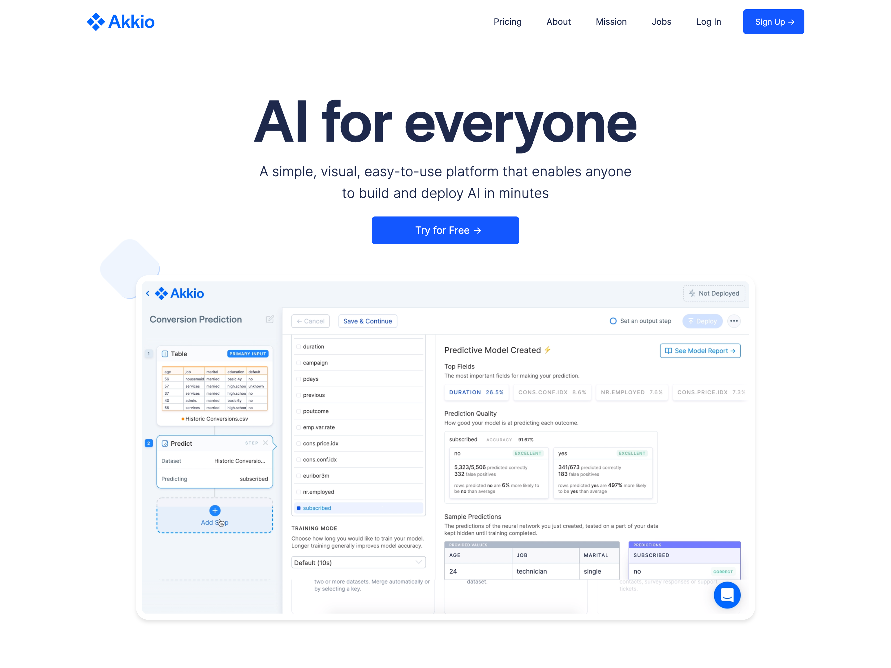 Akkio is a simple, visual, easy-to-use platform that enables anyone to leverage the power of AI in their business. Train and deploy AI models in under 5 minutes. No consultants. No software to install. No sales conversations. No AI experience needed. Try free and see how AI can help grow your business.