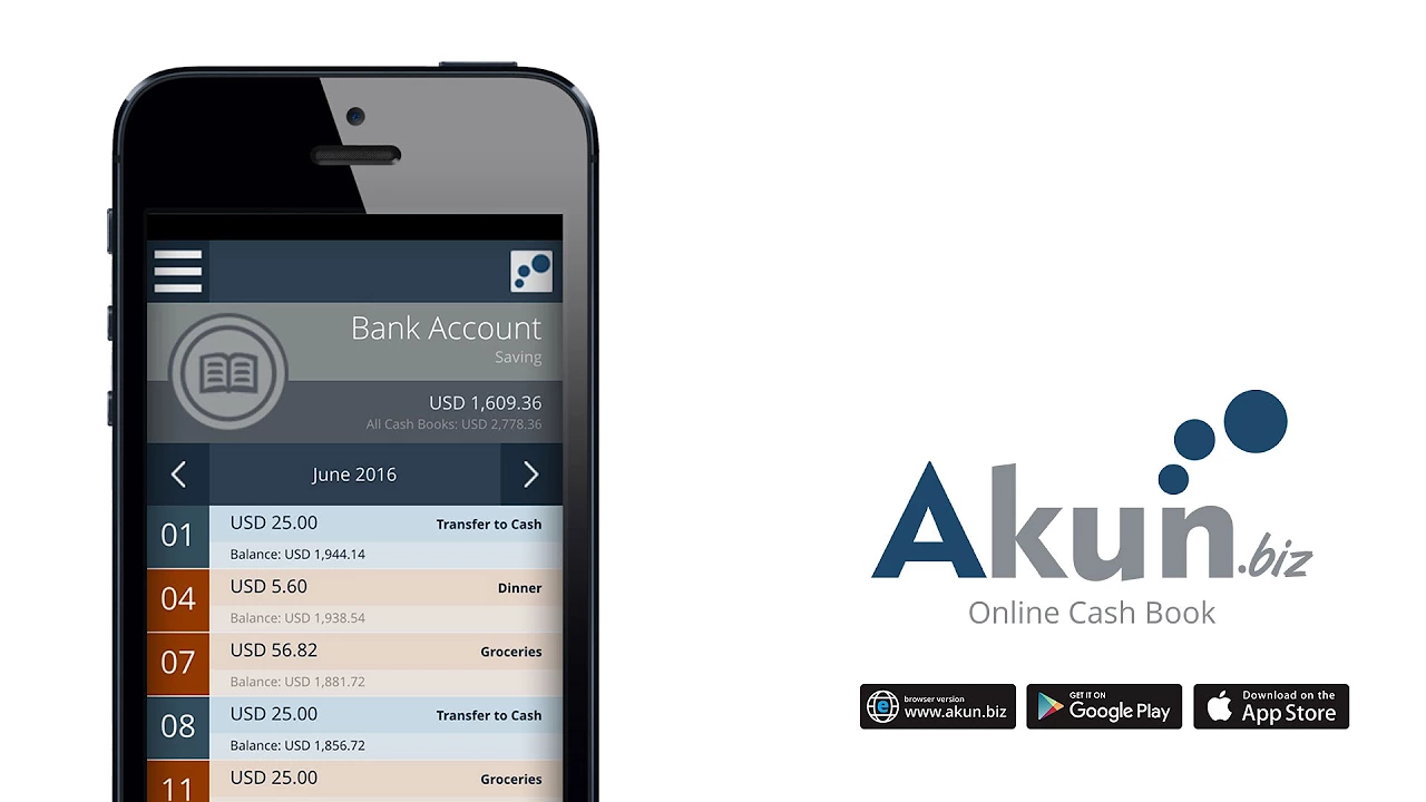 AKUN.biz is a cloud based financial app which allows you to quickly and easily record incomes, expenses, debts, and receivables. This user-friendly app works like a ledger or petty cash book with some premium features such as beautiful graph and downloadable cash reports, multi-cashbook, multi-users, online notes, and online invoices. AKUN.biz available in web based, Android, and iOS. For more info please visit https://www.akun.biz .