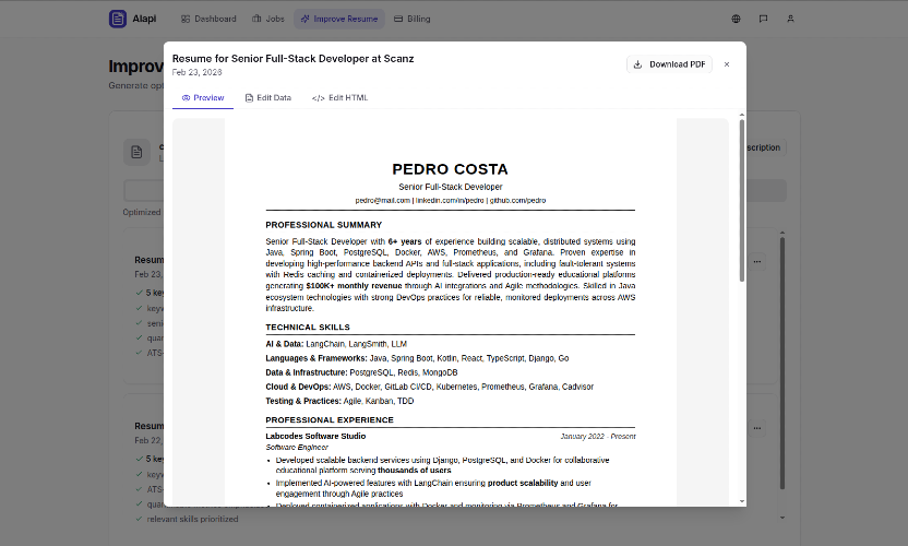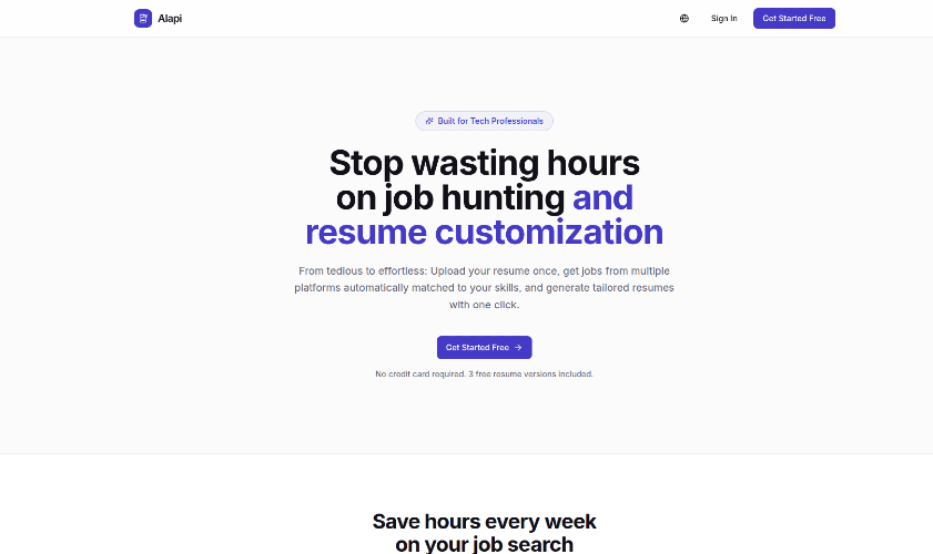 Maintain one resume. Align it with any technical role. Alapi analyzes job descriptions and helps developers emphasize the relevant stack and experience without rewriting everything from scratch. Structured, editable, and built for tech professionals.