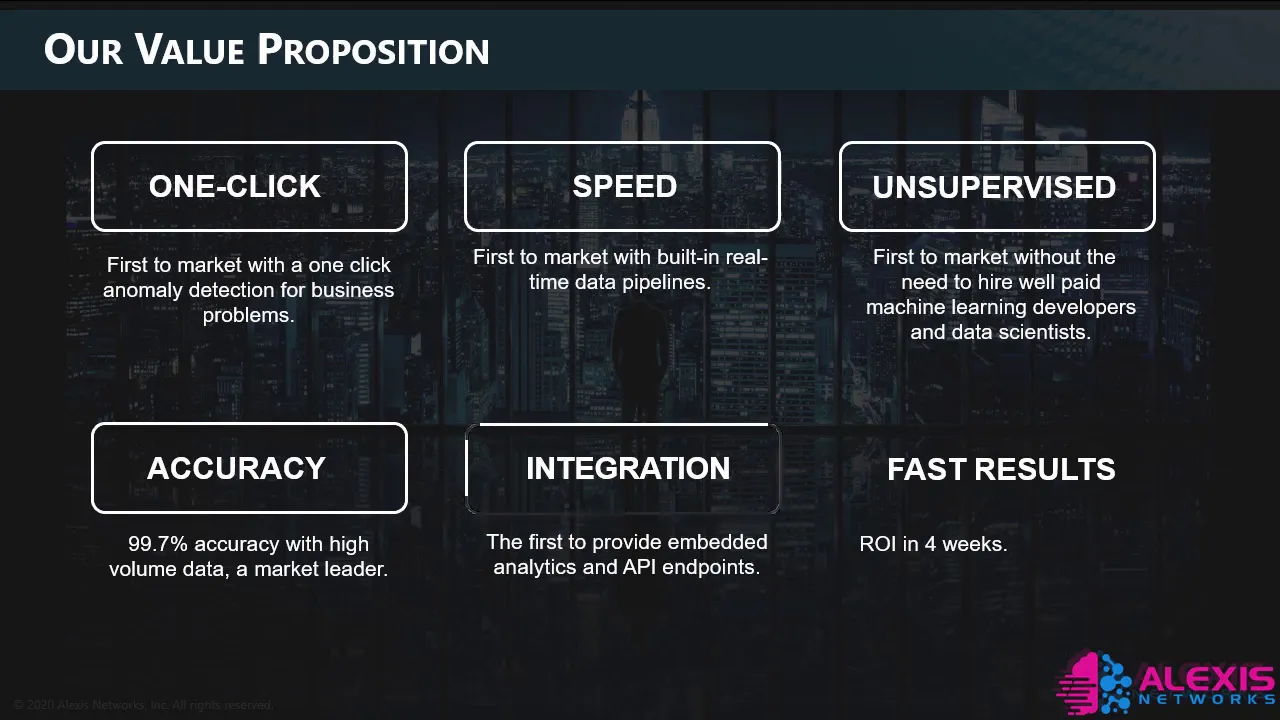 Alexis Networks is the first to market to offer hands-free fraud detection and prediction solutions - fully automated - 100% unlabelled data and 100% unsupervised machine learning. Alexis Networks is saving companies multi-millions. It costs more than $3M for many years before a company sees ROI from its data science investment. This is because of the existing data science solutions for fraud detection and prediction are manual solutions and manual processes. Alexis Networks is the cutting edge solution significantly better than current technologies.
