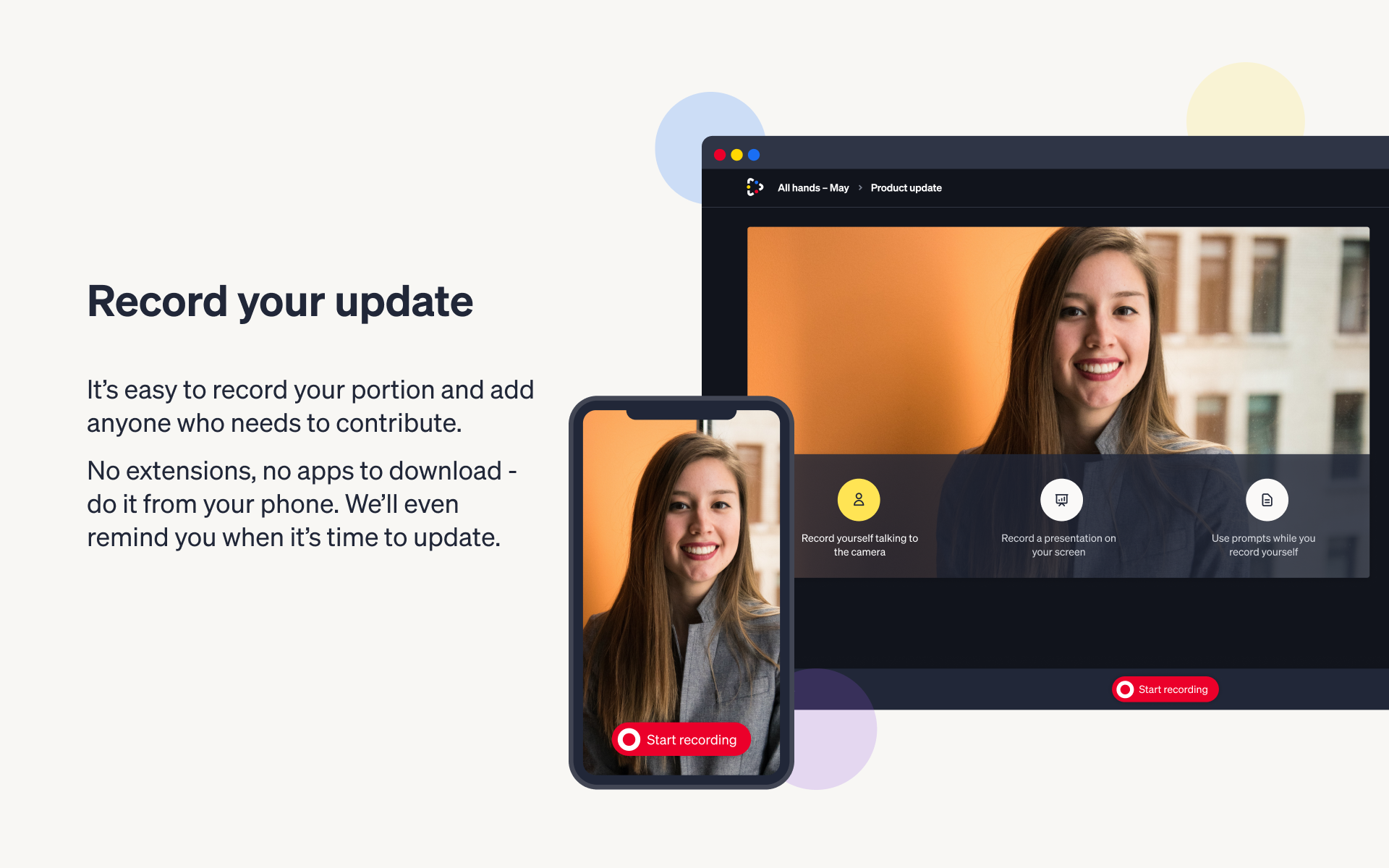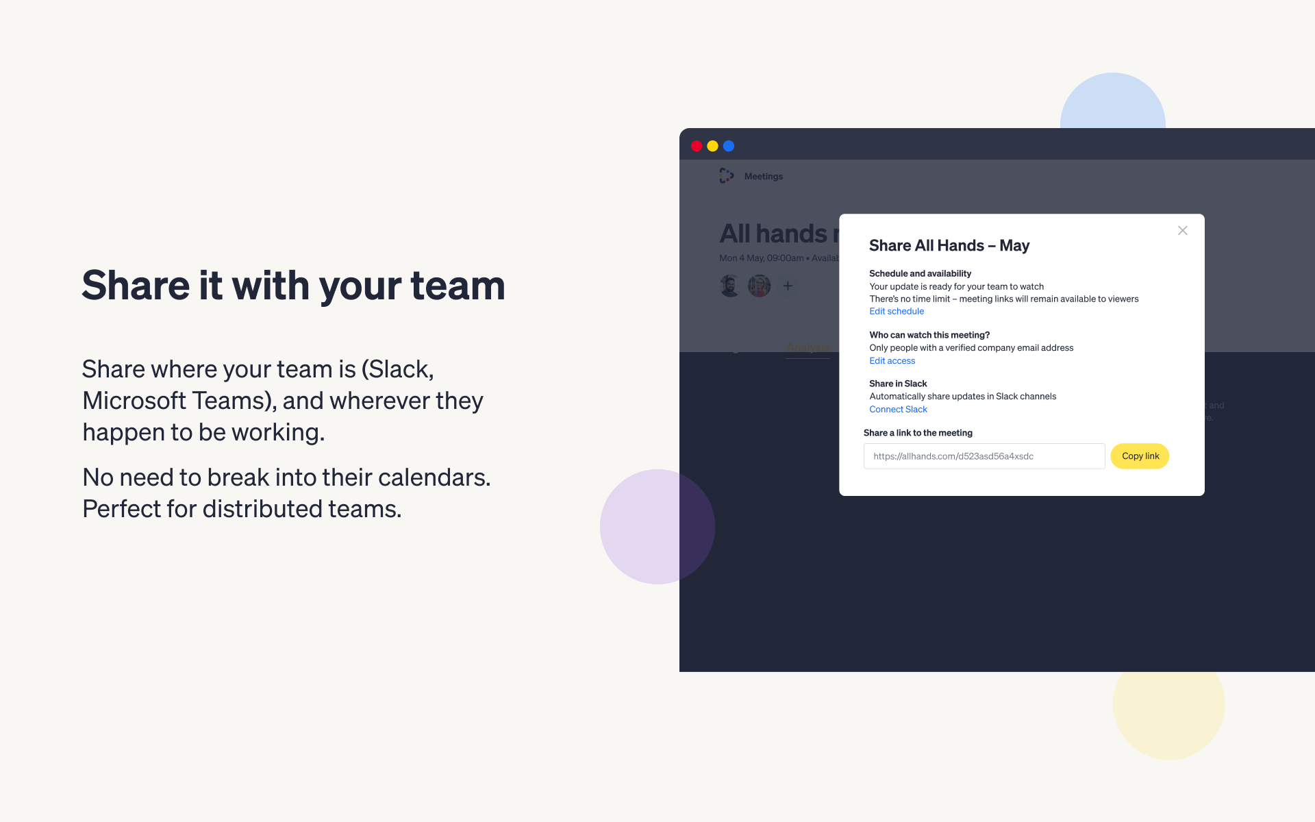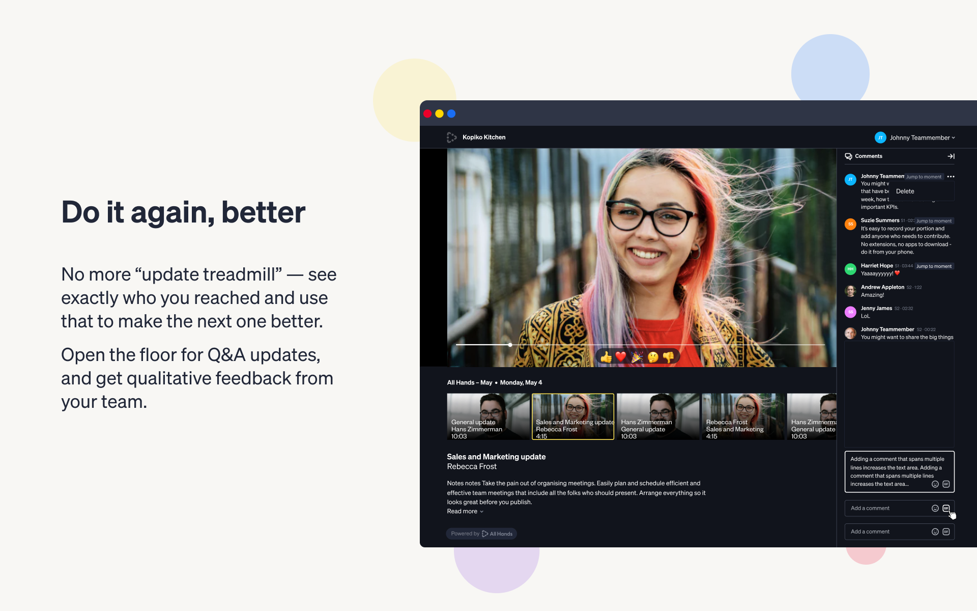 All Hands helps you to pre-record and send frequent video updates to your team. You can share them via Slack, and your team can view, react + comment. Afterward All Hands gives you detailed analytics + feedback so you can make the next update even better.
