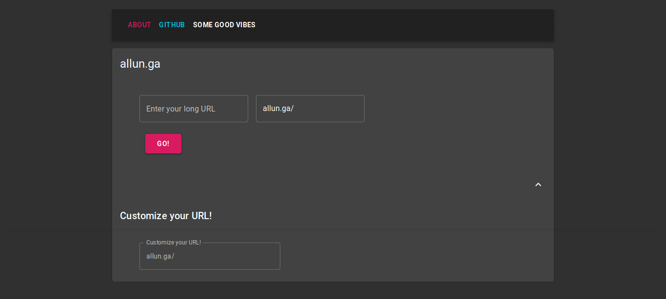 Allun.ga is an italian [open source, succint, vaporwave, material-design] based URL shortner, written in ReactJS. Allun.ga's name come from an italian verb which means 'to extend', we choose it to create the domain hack and obviously the wordplay. Allun.ga is against racism, women harassment, pineapple bacon pizza and, of course, light themes in IDEs. Feel free to use Allun.ga to shorten your url, but remember that we are in beta, so be patient if something doesn't work properly: open an issue on our Github repo, we'll work on it ;)