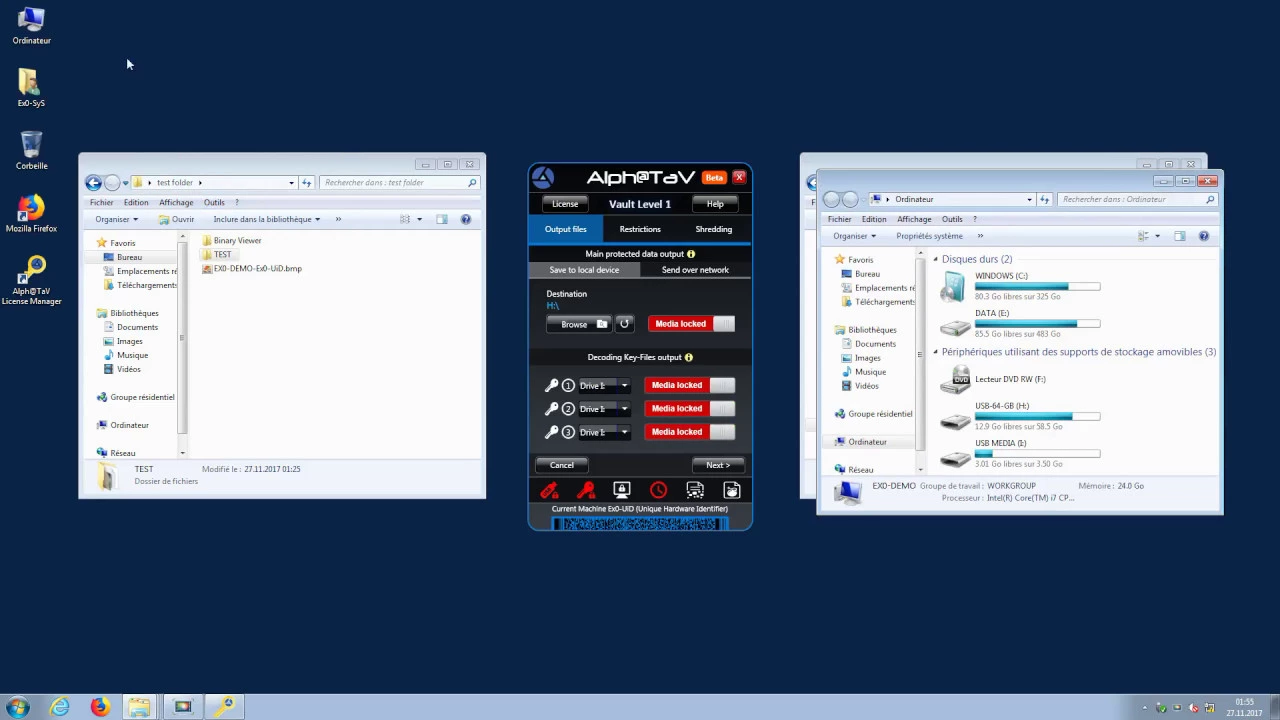 There are many ways to protect your digital data today and it is not so easy to choose the right solution to really suit your needs. Alph@TaV is a new approach to secure any type of files / folders, based exclusively on a proprietary algorithm that our company has invented and developed internally; for security reasons we have never used any known algorithms. Our concept of protection is based on a system with 3 Unique Security Keys plus the secured data itself; and each one of the obtained files have no coherence if used out of its own context. In addition, the data set itself is secured by an input key between 3,000 / 9,000 and up to 27,000 bits long depending on the parameter selected by the user during the encoding process. You can set restriction options to allow to open your secured data only to selected computers defined by the unique hardware identifiers and you can decide the time limit during which the data can be decoded. More info ? please contact us : [email protected]