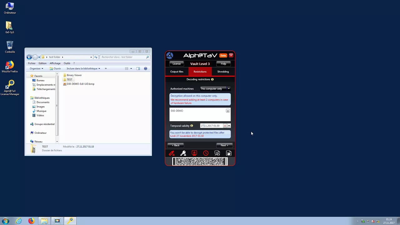 Alph@TaV Vault is a software to ensure advanced and customizable security of digital data through a new approach to binary information processing; it is not based on any algorithm or concept of conventional cryptography. The basic concept of Alph@TaV Vault is to describe the binary information relating to a given data and not to transform it, and then to fragment it into 4 separate files. Once the security process has been completed, it is impossible to link the secure files to each other because none of them has a coherent internal binary structure that can be analyzed or identified. Each file thus produced can therefore independently be exposed to the eyes of all without risking compromising the confidentiality of the secure information. Nothing is exploitable without physically possessing all 4 files with of course all necessary accreditatons allowing their exploitation, this at the risk of their immediate and definitive destruction if not authorized.