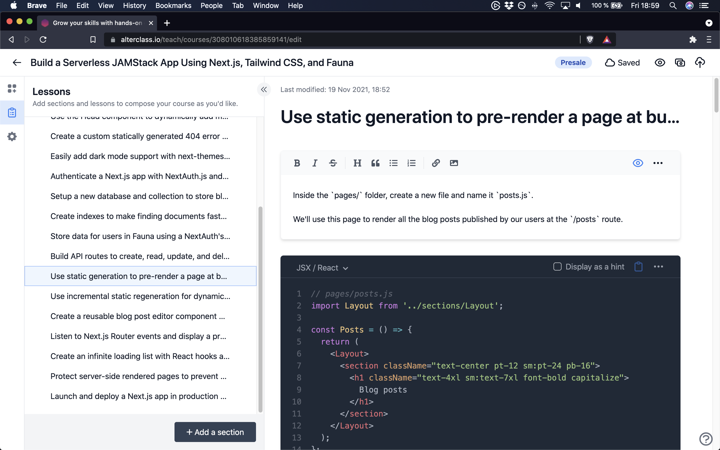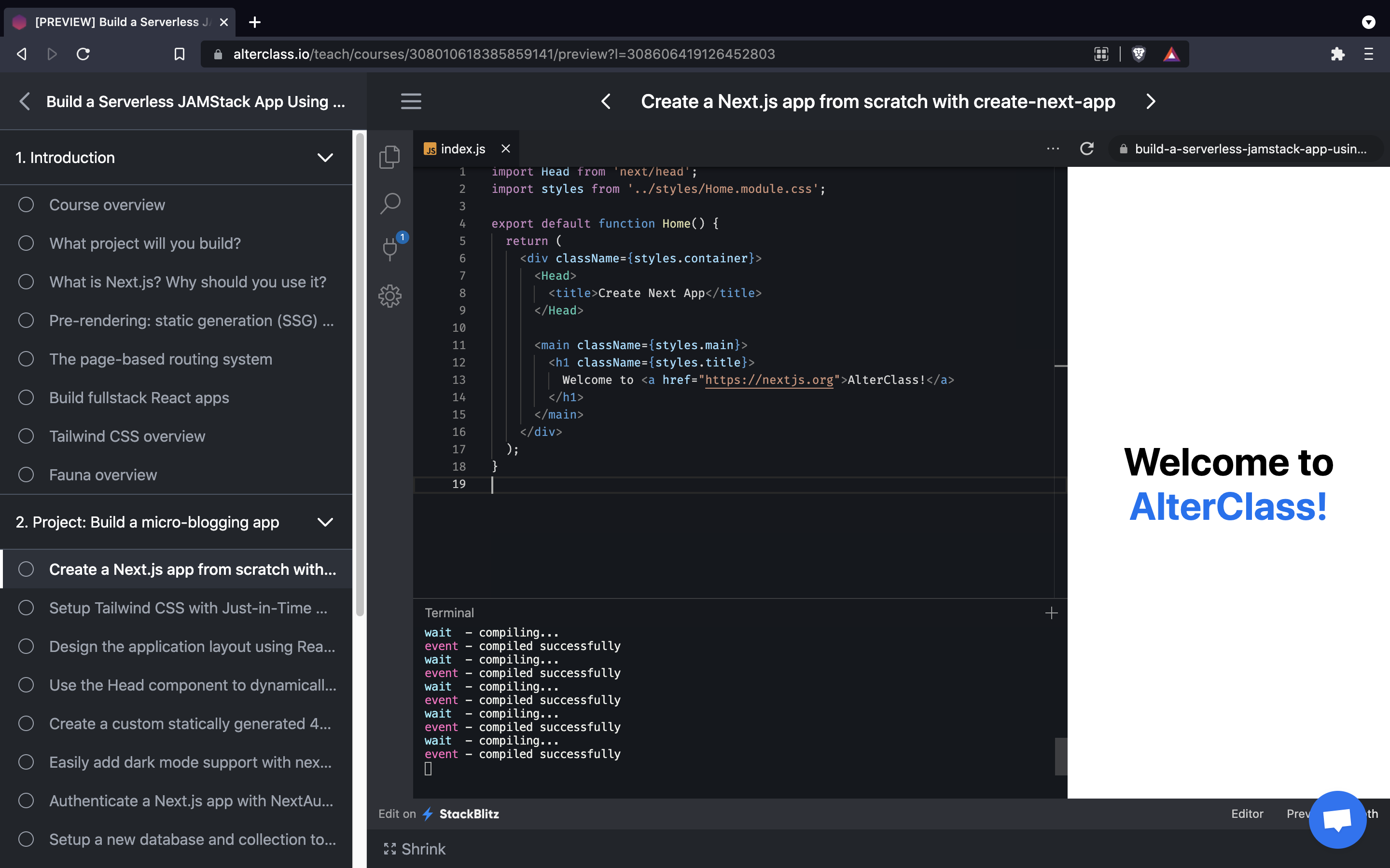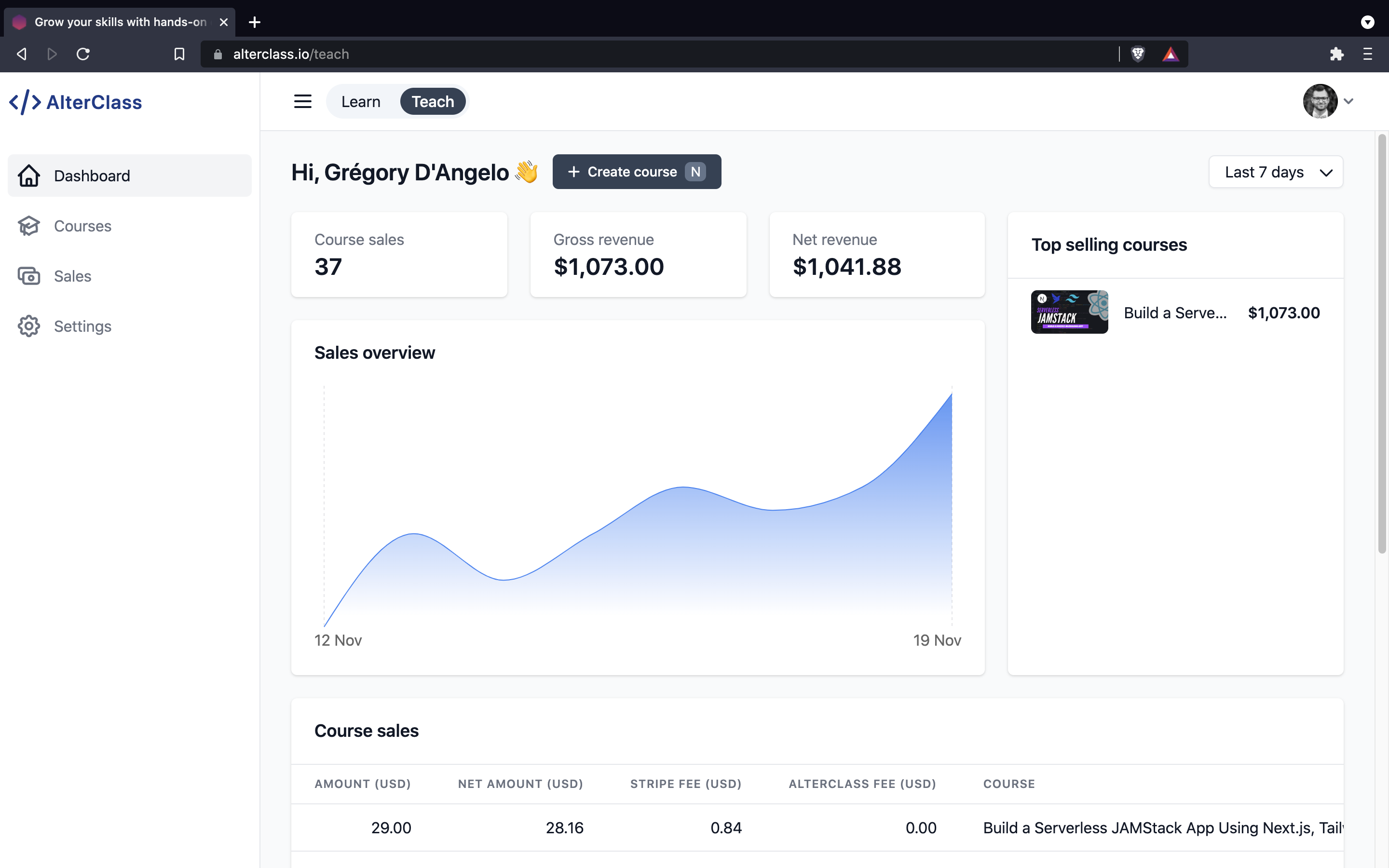Alterclass is the all-in-one platform for creating and selling your programming courses online. You got skills. Monetize them! 1. Build interactive programming courses Unlike other platforms, AlterClass supports multiple block content types to compose your lessons: quizzes, code snippets, embedded coding environments, videos, rich-text articles, and more. You can now create the best learning experience for your students without being restricted to only video-based content. 2. Earn money from your experience and skills Transform your experience and skills into a thriving and profitable online course. We make it easy for you to sell your knowledge with our integrated payment processing powered by Stripe. 3. Bring your course to life Creating and launching a great course takes time. With AlterClass, you can fund your course with pre-orders so that your friends, family, and fans, can support you in your journey. Spread the word about your upcoming course while you are still building it. Create your first course today!