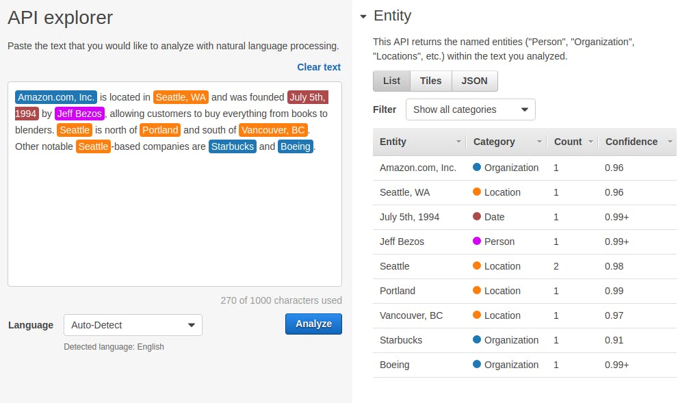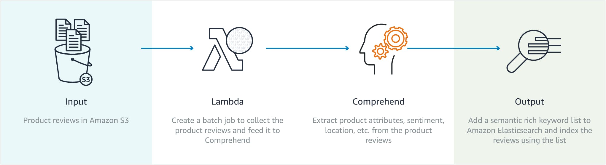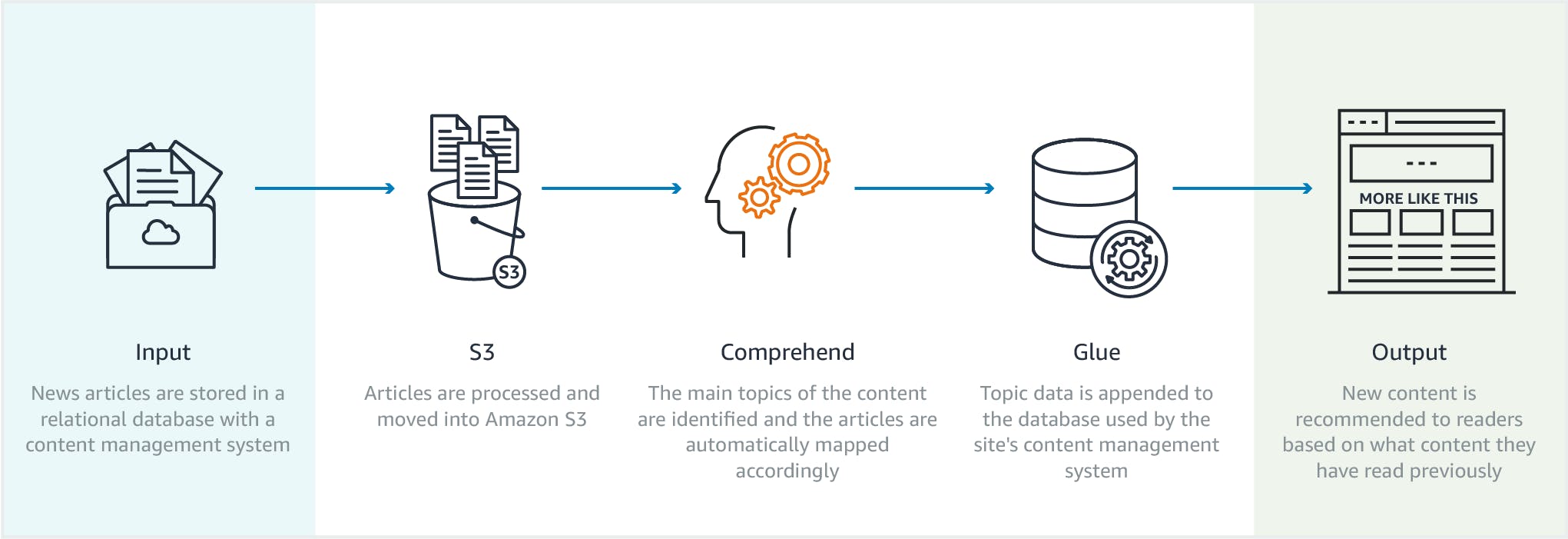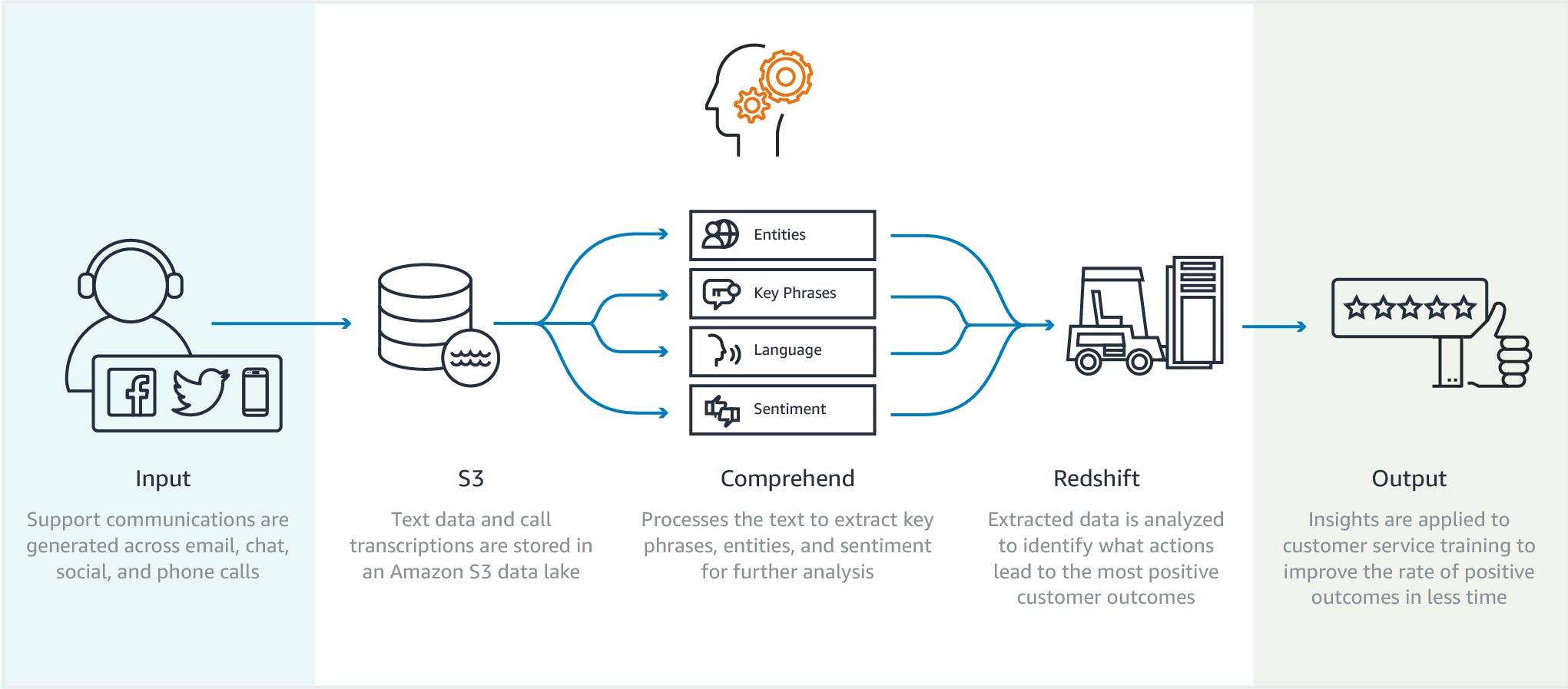 Amazon Comprehend is a natural language processing (NLP) service that uses machine learning to find insights and relationships in text. Amazon Comprehend identifies the language of the text; extracts key phrases, places, people, brands, or events; understands how positive or negative the text is; and automatically organizes a collection of text files by topic. Benefits : - Get better answers from your text. - Identify topics in a collection of text. - Continually learning, always improving. - Integrated with Amazon S3 and AWS Glue.