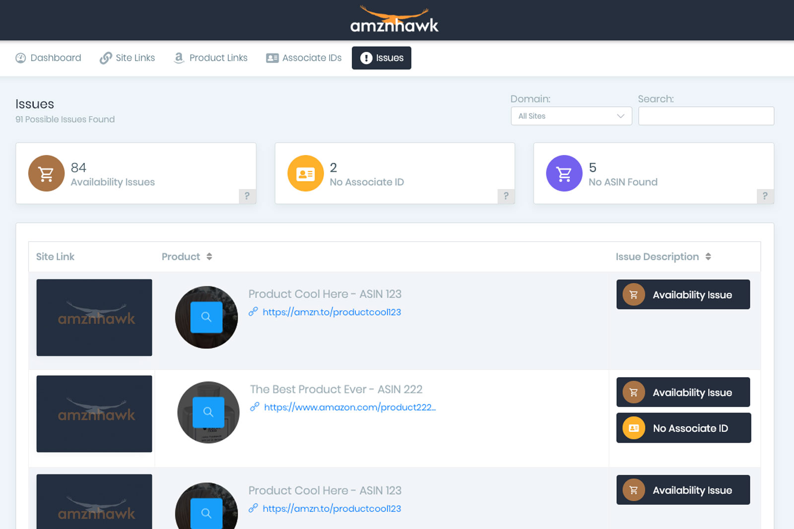 AmznHawk monitors your amazon affiliate sites 24/7, checking every page on your site for uptime, and then analyzing each and every affiliate link you have. Any time you have broken links, link to unavailable products, use the wrong affiliate id, an issue is created and you are alerted. With so many plugins stealing your commissions these days we put together this tool to protect your traffic and clicks from cloakers and from your own linking mistakes. A must have for anyone that manages multiple amazon associate sites.