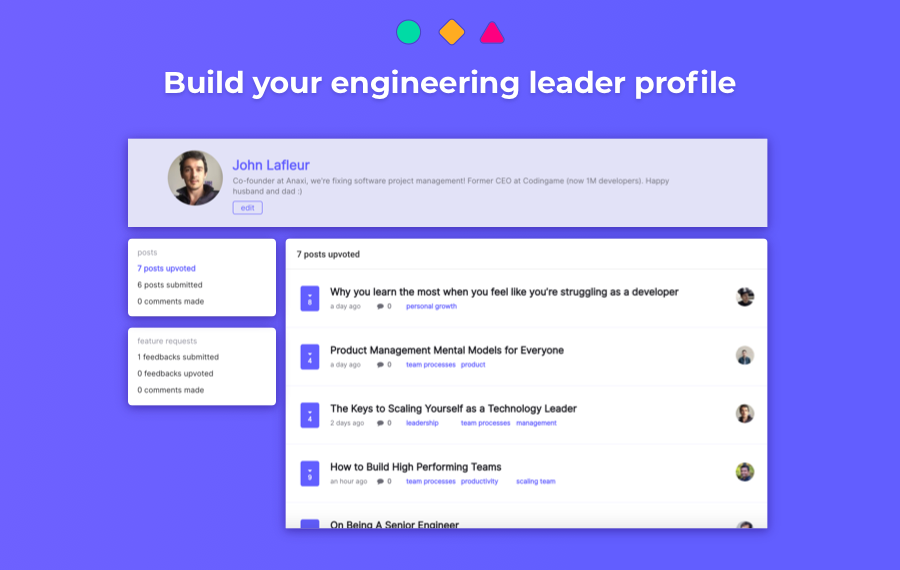 Curate and discover high-quality trending articles on engineering leadership, productivity, how to scale teams and much more. Follow the tags that most matter to you and start building your engineering leader profile.