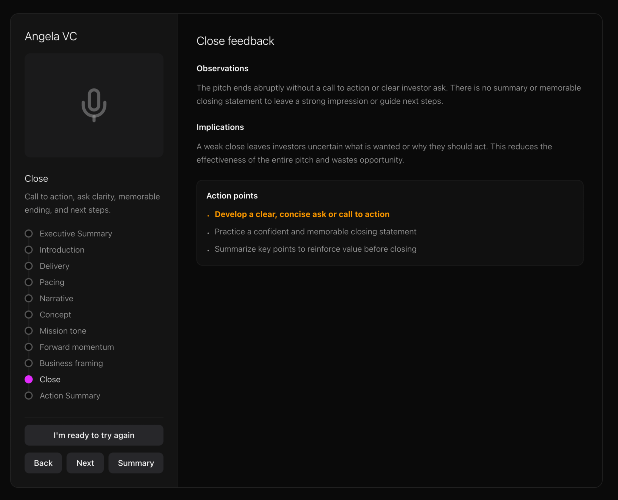 Angela.VC helps startup founders prepare for VC pitches. Practice your pitch on a realtime call with Angela and get instant feedback to help you improve using AI analysis. We break down the pitch into multiple areas using actual frameworks VCs use to assess your pitch. We also analyze sentiment and narrative etc. Don't let your first presentation be the one that counts. Practice makes perfect. It's free.