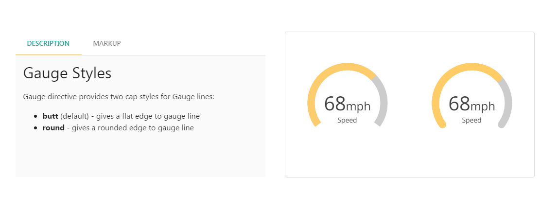 angular-gauge is a highly customizable gauge directive for Angular JS apps and dashboards. It provides multitude of options to customize as per your needs.