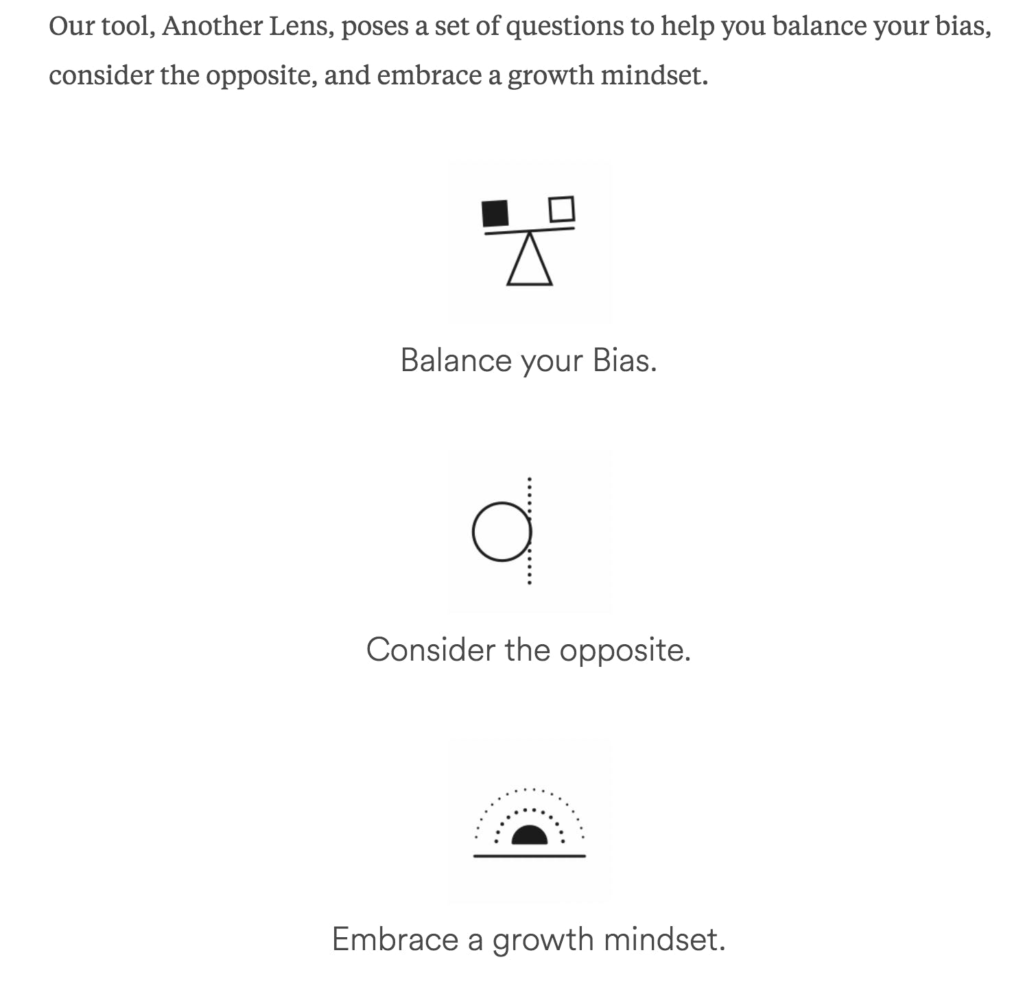 Designed by Airbnb and News Deeply, Another Lens is a research tool for conscientious creatives, posing a set of questions to help you balance your bias, consider the opposite, and embrace a growth mindset. It contains a set of guiding principles (balance your bias, consider the opposite, and embrace a growth mindset) and exercises that help creatives address skewered perspectives in their process in order to create more inclusive solutions.