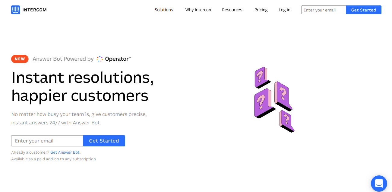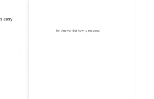 Answers you control You tell Answer Bot exactly how to answer, so responses are always consistent and in your brand voice. Complements your team Let Answer Bot take care of simple questions, while your team handles those that need a human touch. Easy to train Teach Answer Bot to recognize similar questions using examples from your previous conversations. Intelligent curation Answer Bot analyzes your conversations in Intercom or Zendesk Chat to suggest answers to automate. Get customer insights Know your common questions, find new ones to automate and measure time saved with insightful reports. Reduce repetitive work Save your team from answering the same questions over and over, so they can focus on more productive tasks. Automate question prompts Answer Bot prompts customers to ask their question, so you’re not repeatedly asking “how can I help?”