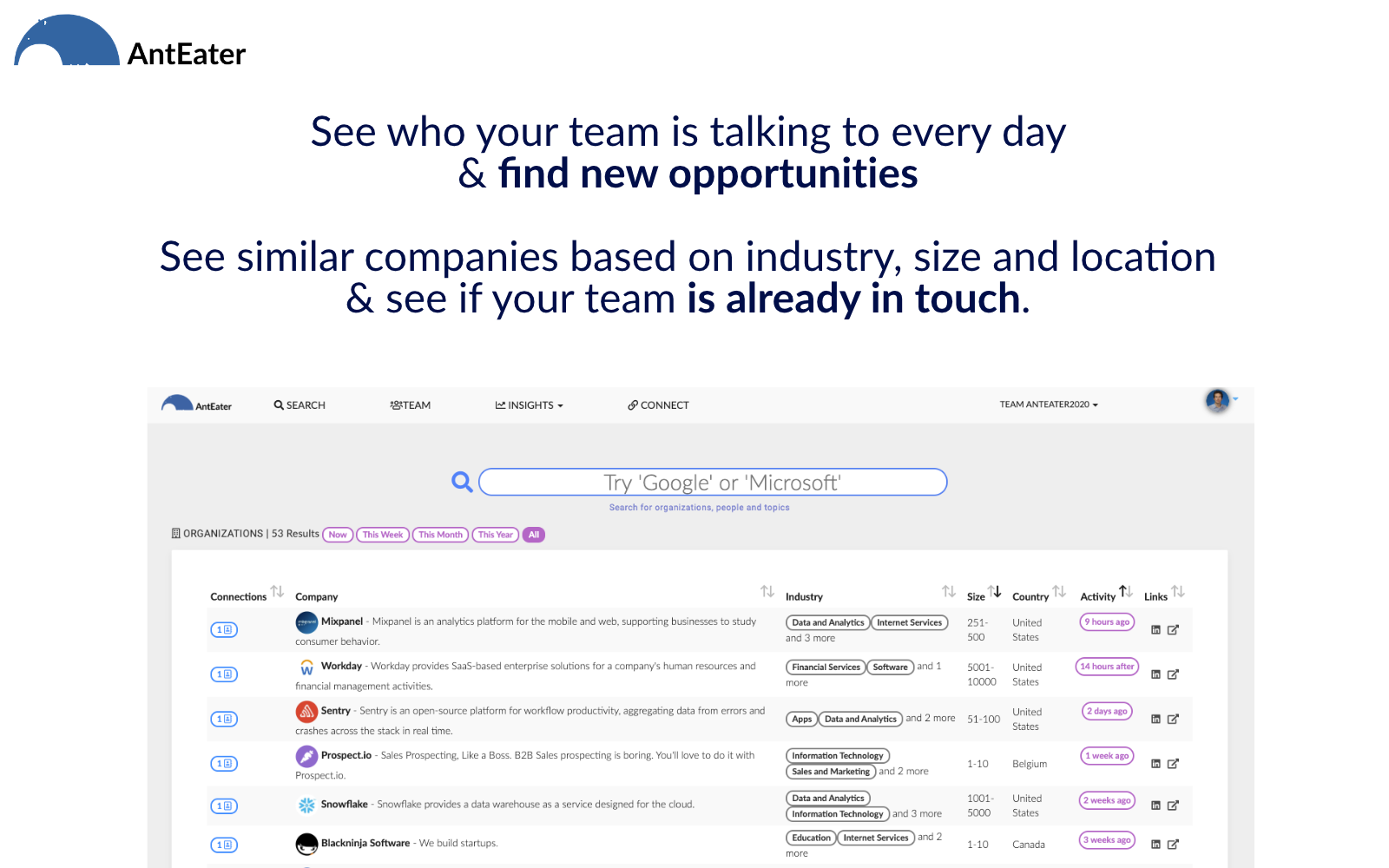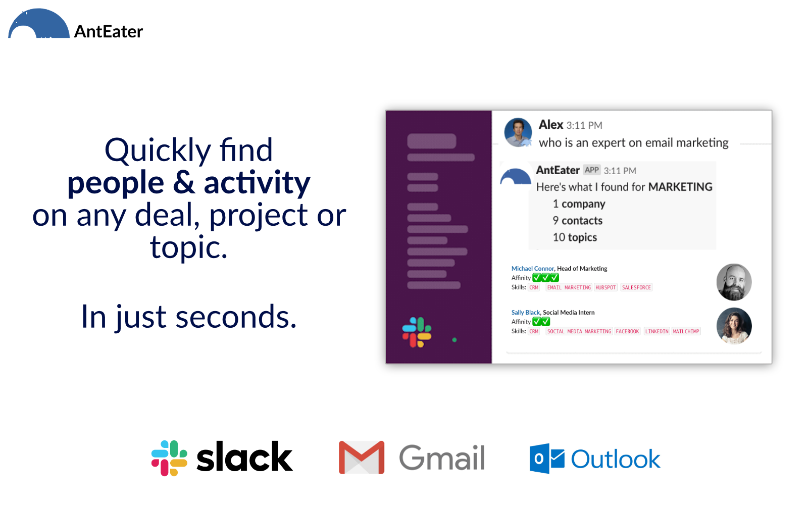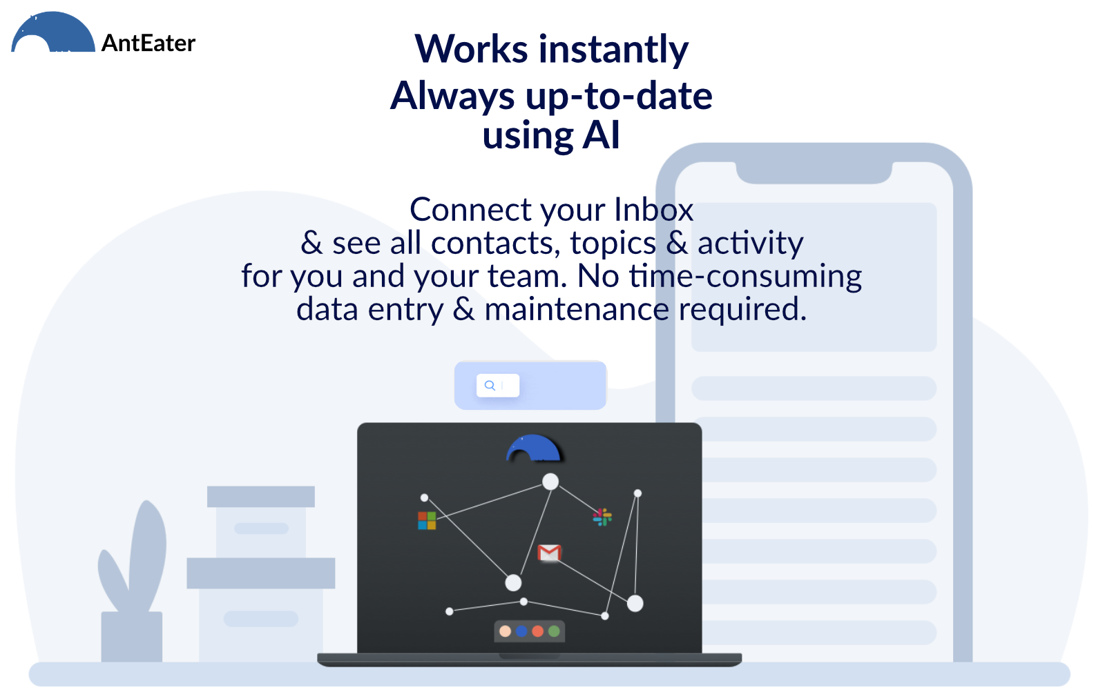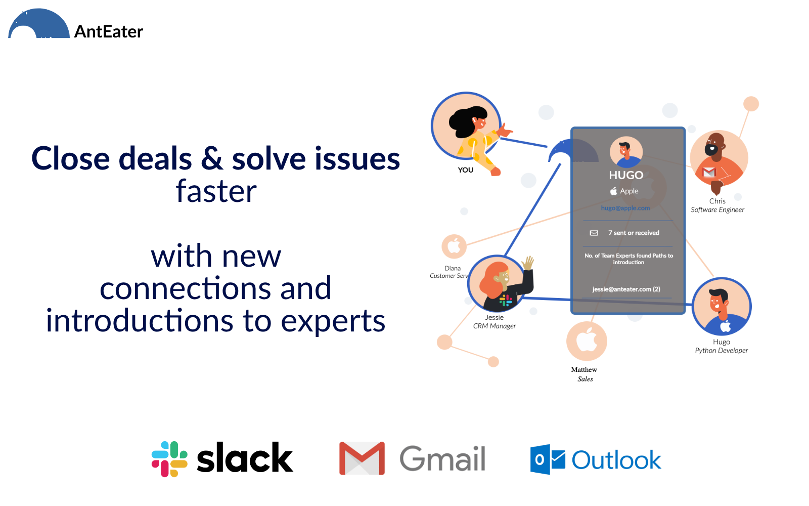 CRMs, team directories & spreadsheets are difficult to setup and take a lot of time keep up to date. AntEater works instantly, is always up-to-date, using AI Quickly find people & activity on any topic Close deals faster with new connections and introductions Hard to believe? We've heard that. It takes just 30 seconds to try it out for yourself